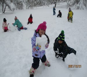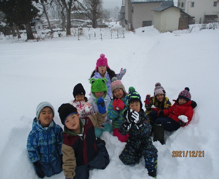 ・友だちと楽しさや気持ちよさを言葉で伝えあい、共有しながら思いっきり遊び、「先生も、一緒にねよう!空がきれいだよ」と子どもたちに誘われて雪の上にダイブ!!真っ青な青空がまぶしく雪がキラキラ輝いていてとても爽快な気分をみんなで味わえました。