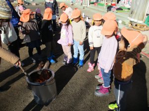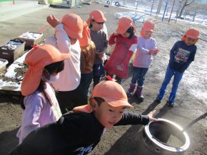 さぁ、窯の薪に火をつけよう! みんなが池田の宮で拾った木の枝や松ぼっくりも入っているよ。
