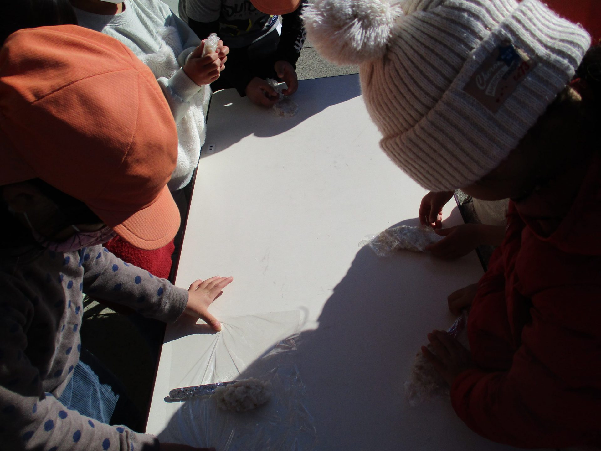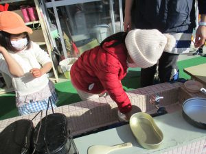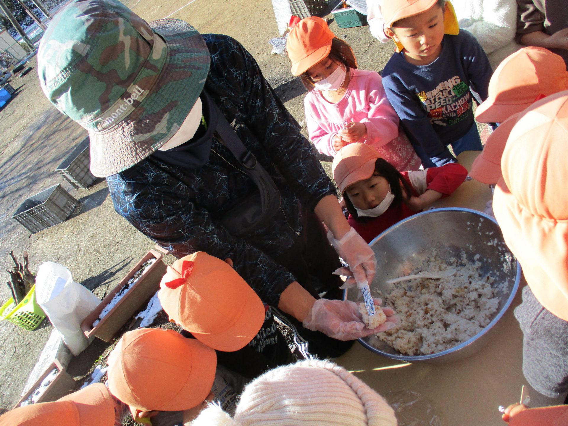 米を洗う際は水の冷たさを感じ、飯盒で米を炊く際は、火の暖かさや煙を感じ、自分たちで成形して、焼けるまでじっと待つ。