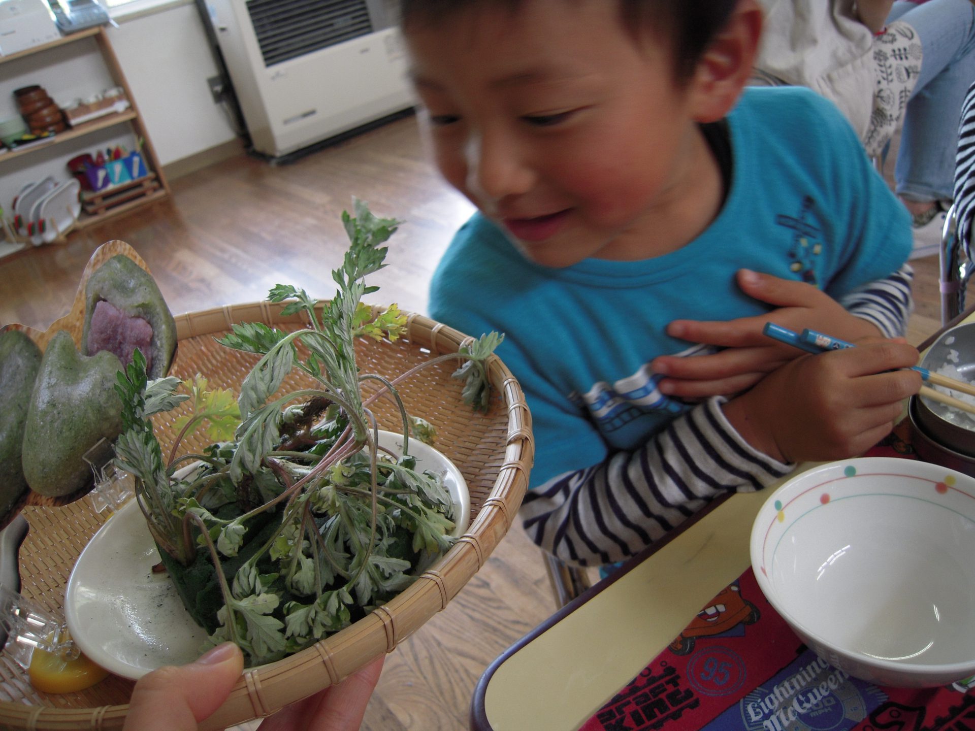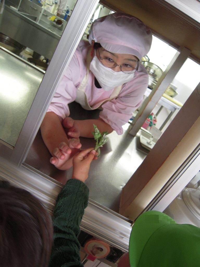 遊びで見つけたよもぎを持っていく子がいたり、一緒にお昼を食べながらおやつの話をしたり、調理室や給食の先生の存在が近い自園給食の良さを改めて感じました。