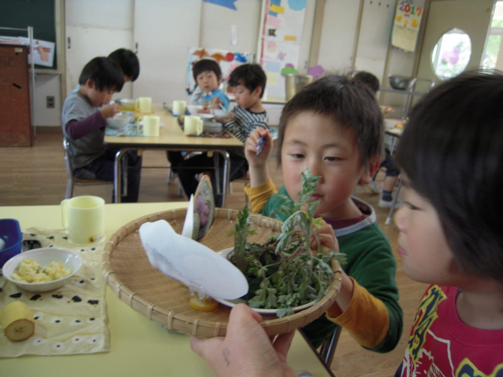 「においしたい!」と栄養士が持ってきたよもぎのにおいをかいでみたいという声があがりました。