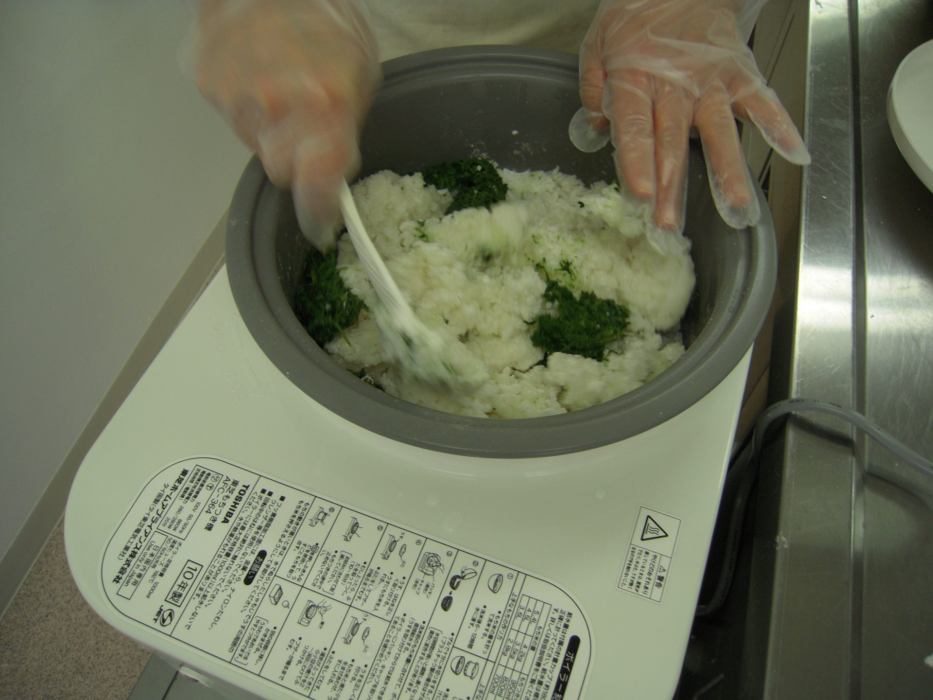 (しゃもじで硬さをみて、硬いようなら湯を入れて調節してください)(※もちつき機がない場合は、すり鉢ですりつぶす)