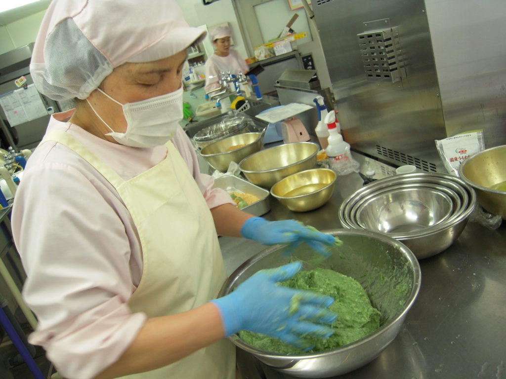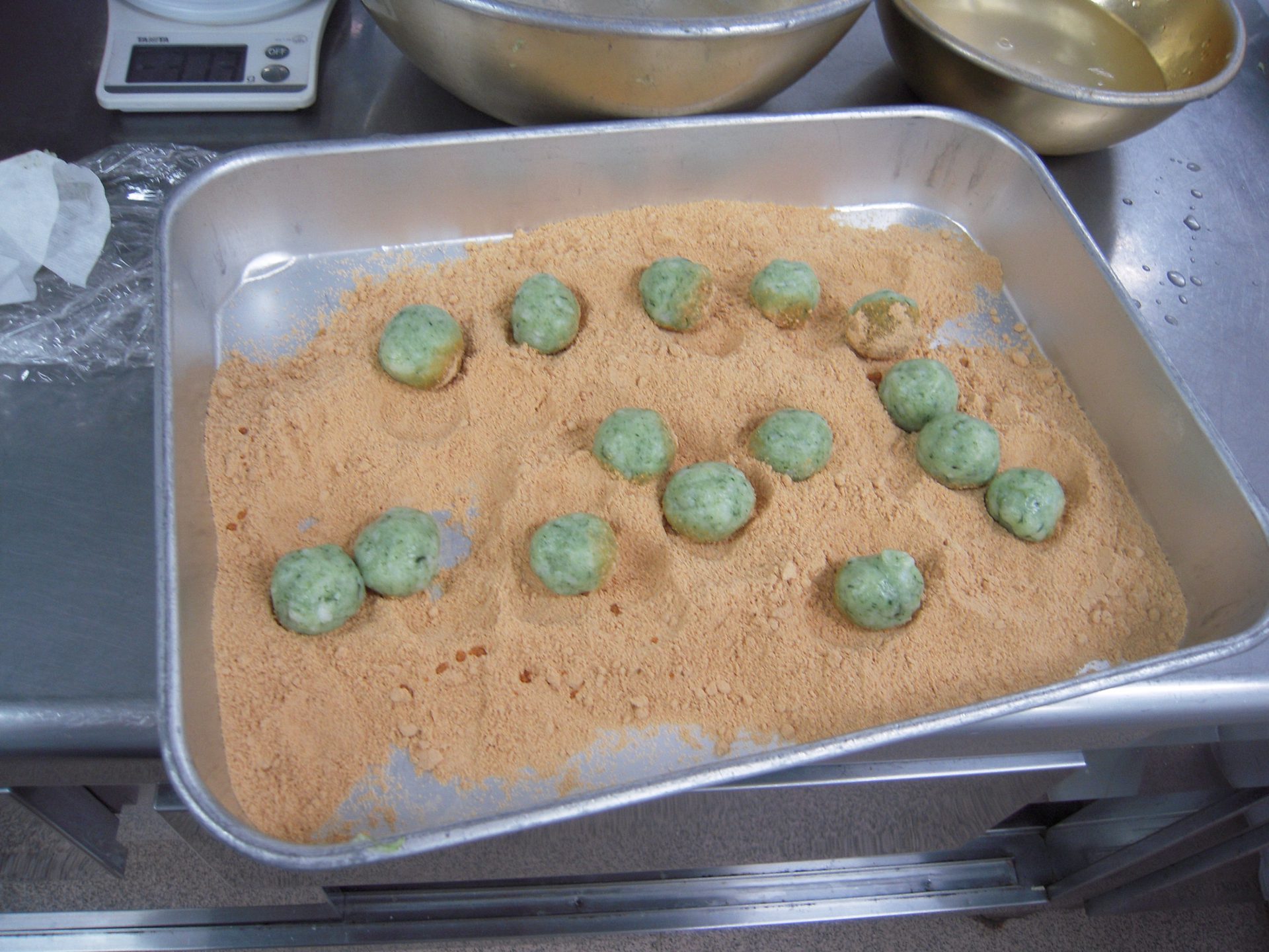 ⑥ ヨモギがきれいに混ざり、団子になったら、餅つき機から取り出し、食べやすい大きさに丸めて、砂糖と塩を混ぜたきなこをまぶす。