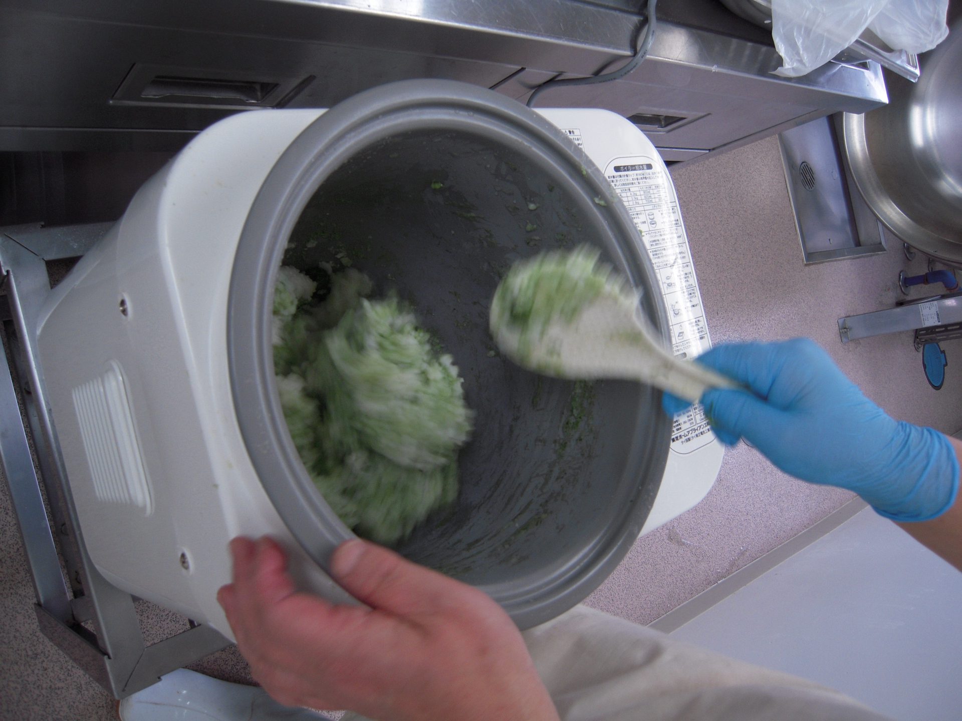 ⑤ 餅つき機のつきをスタートし、ヨモギをちぎって少しずつ加えていく。