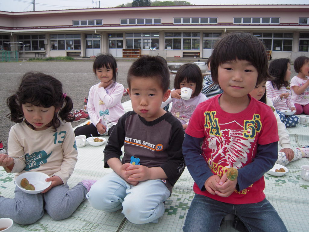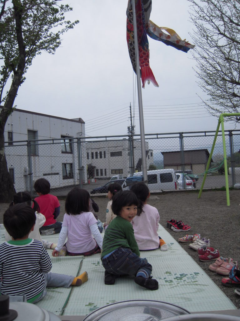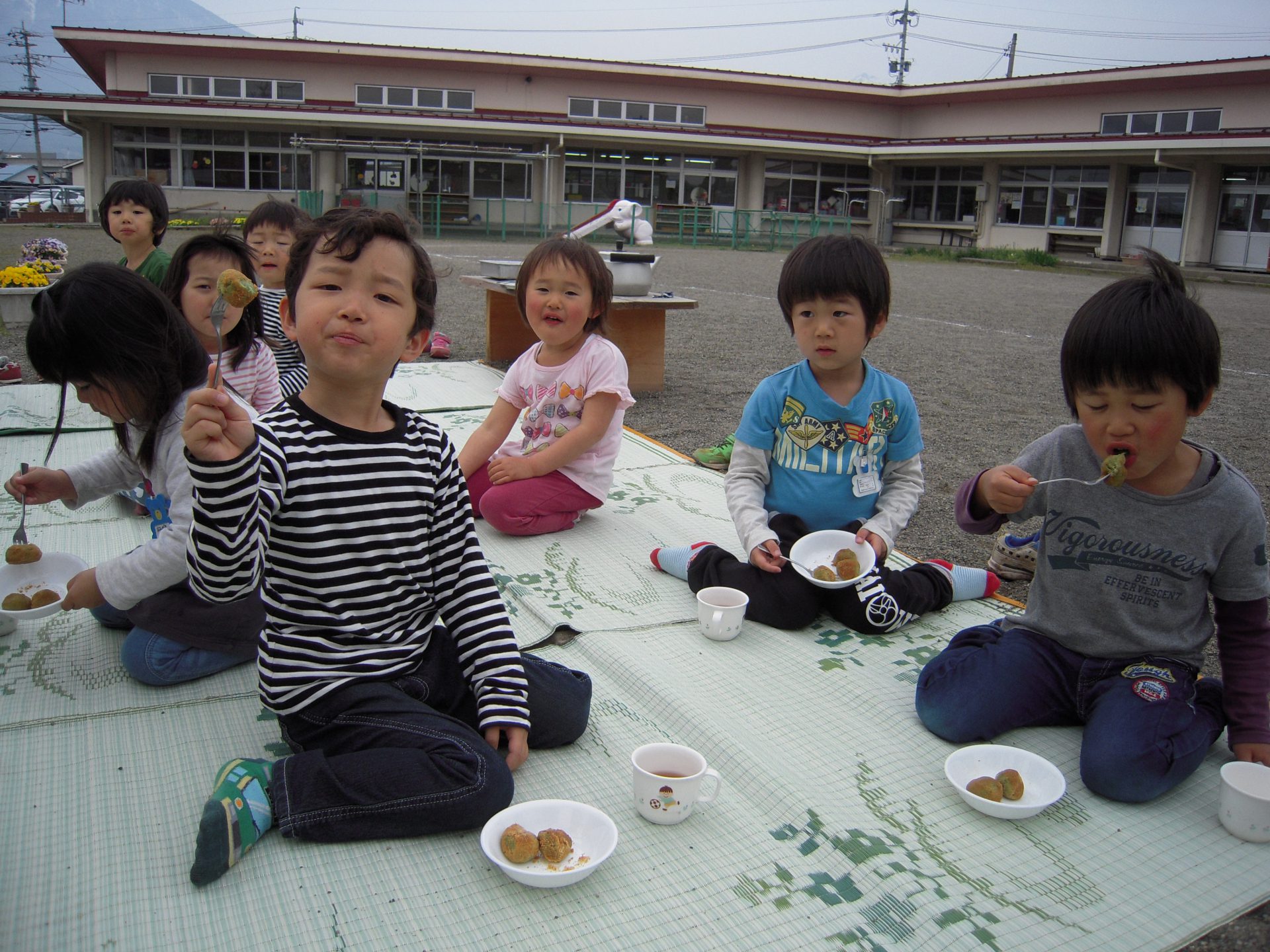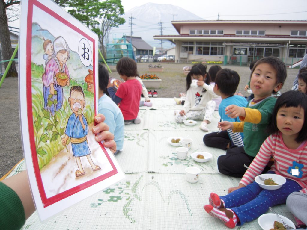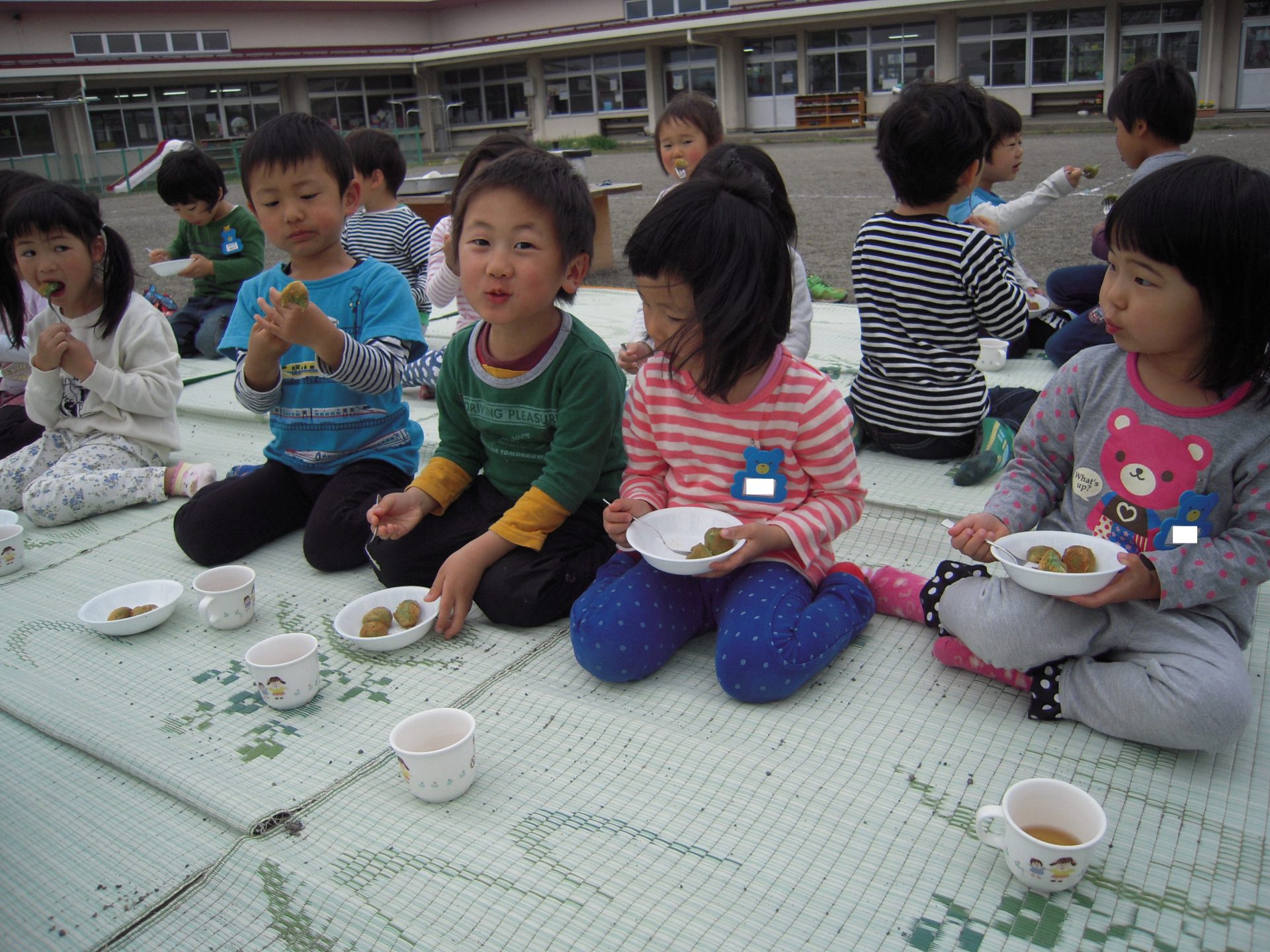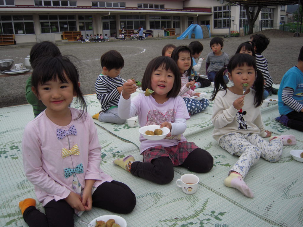 自分たちでよもぎをとった経験と一茶かるた、新緑のきれいな気持ちのよい気候の中、こいのぼりを見ながら食べたこと、様々な経験が重なり、より楽しくおいしくよもぎ団子が食べられたことと思います。
