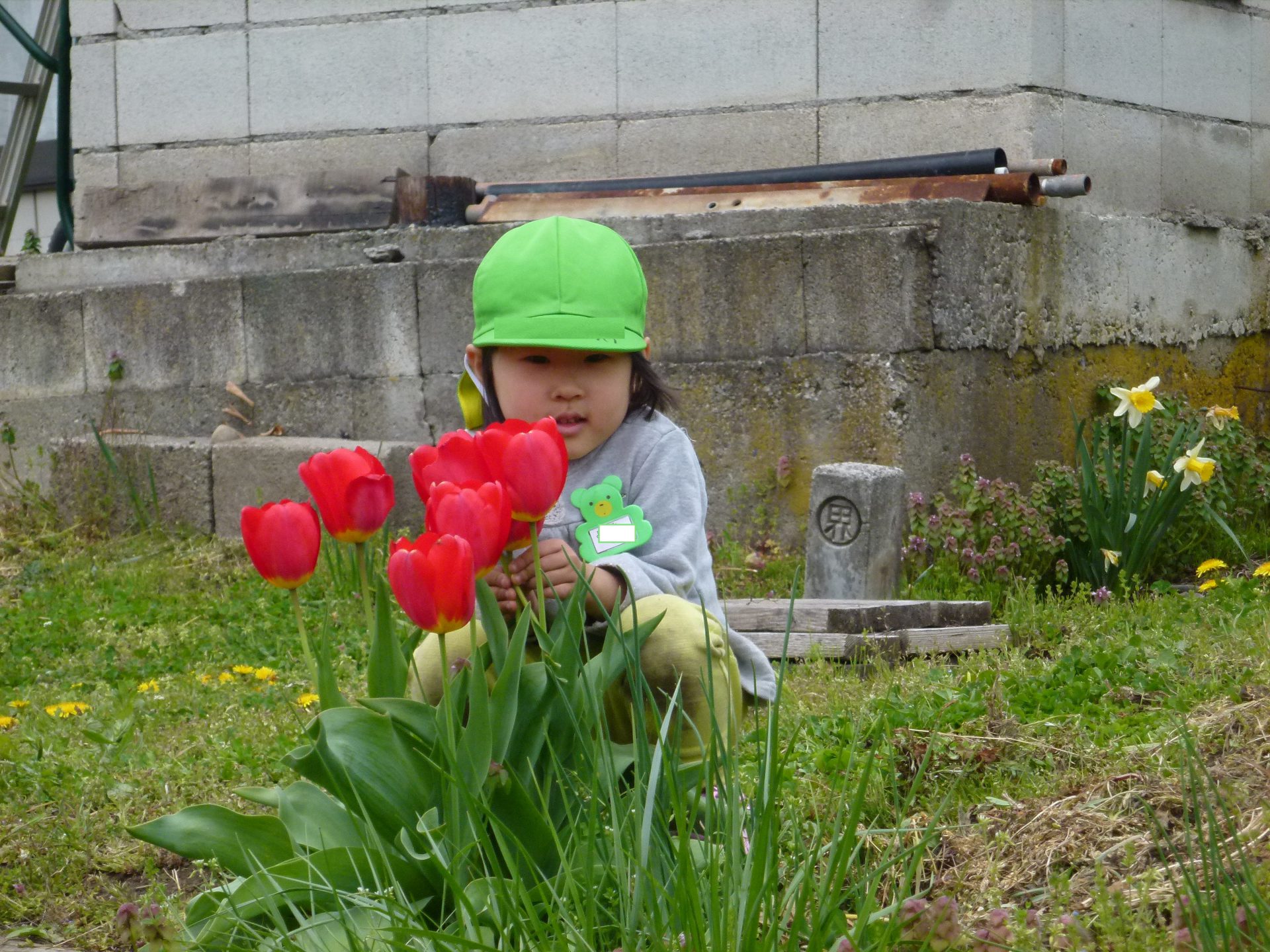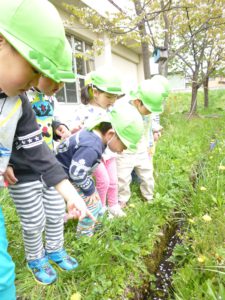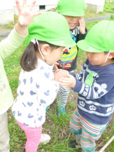 「かえるさん持つときは、やさしく持ってあげてね」と、いたわりの気持ちを持って優しく優しくお友達の手に乗せてあげていました。