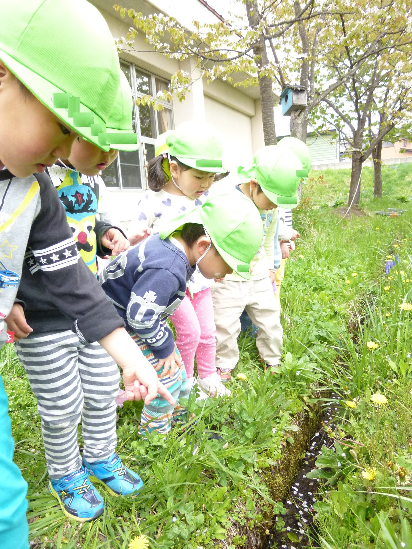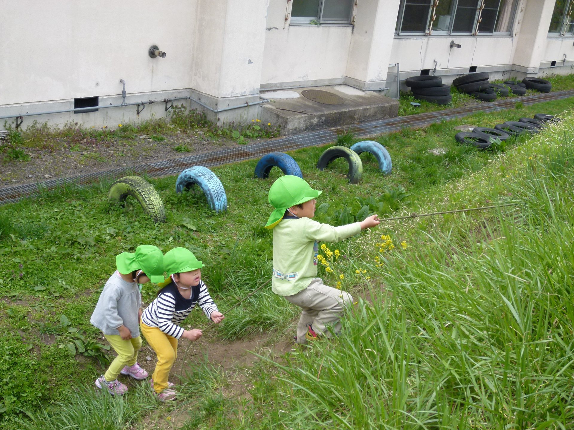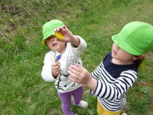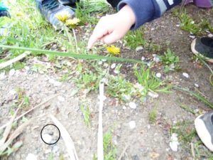 タンポポの茎で笛にもなるんです。吹くときの力の入れたかが難しいタンポポ笛ですが、年少さんでも音が鳴りました。