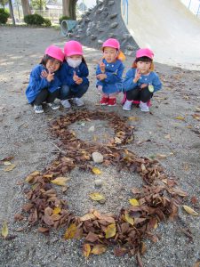 ・園庭に落ち葉のじゅうたんができる毎日となりました。秋から冬へと季節の移り変わりを教えてくれているようです。子どもたちは寒くなってきても、戸外で元気に体を動かして遊んでいます。落ち葉を集めて今日は何をしているのかな?
