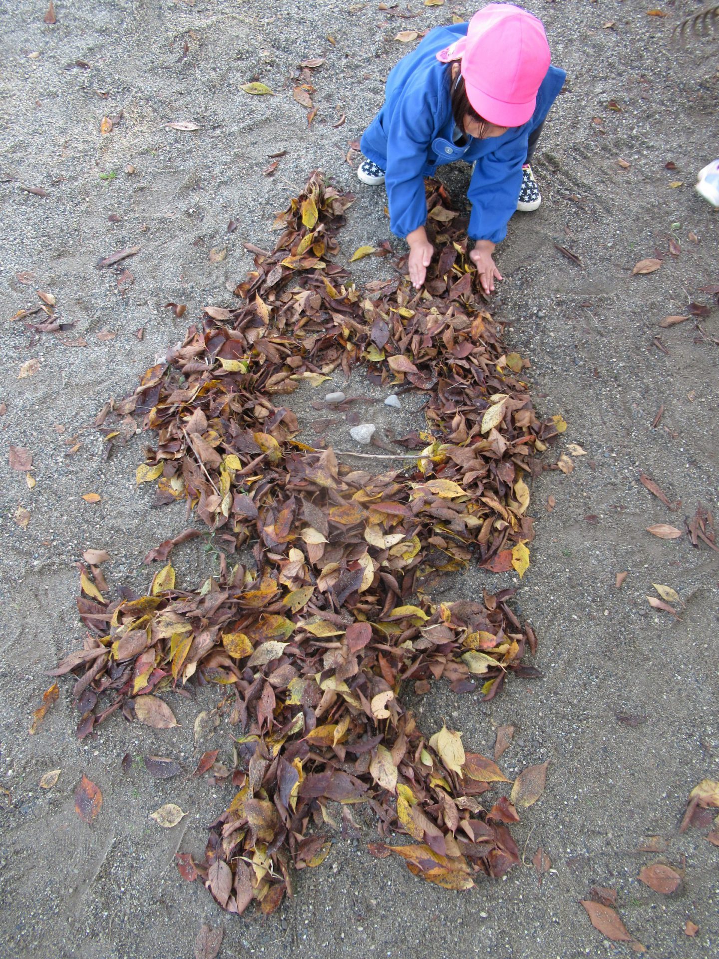 少し手伝って、うさぎを作ることができた。落ち葉が沢山あると、すぐに掃いてしまいがちだが、こういった遊びにつながることもあるので、自然物をうまく使って遊んでいきたいと思う。