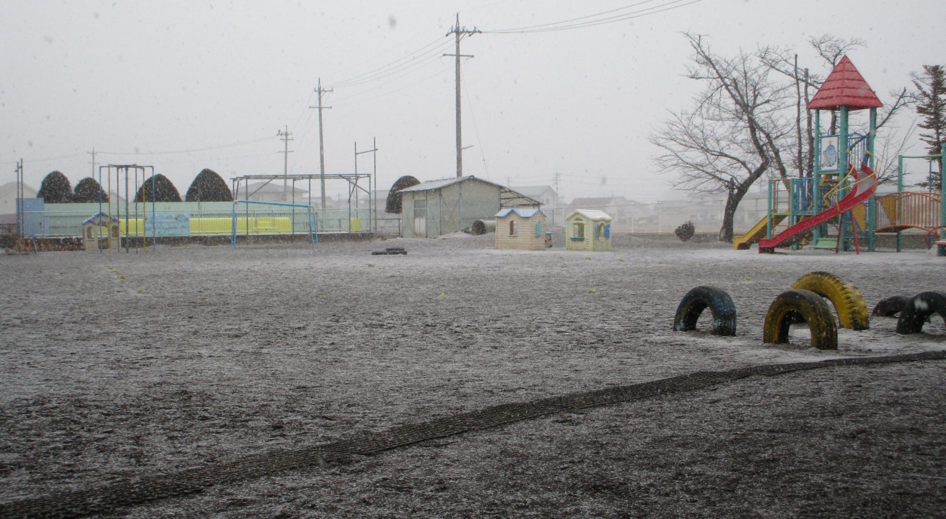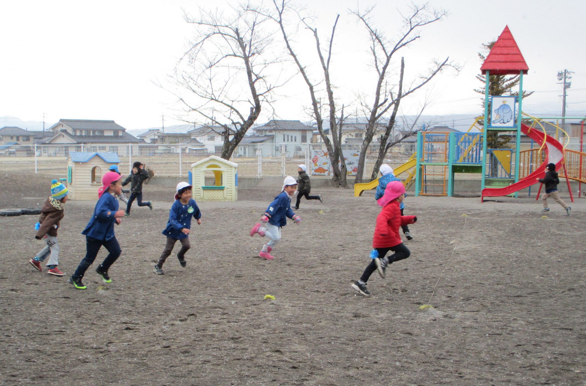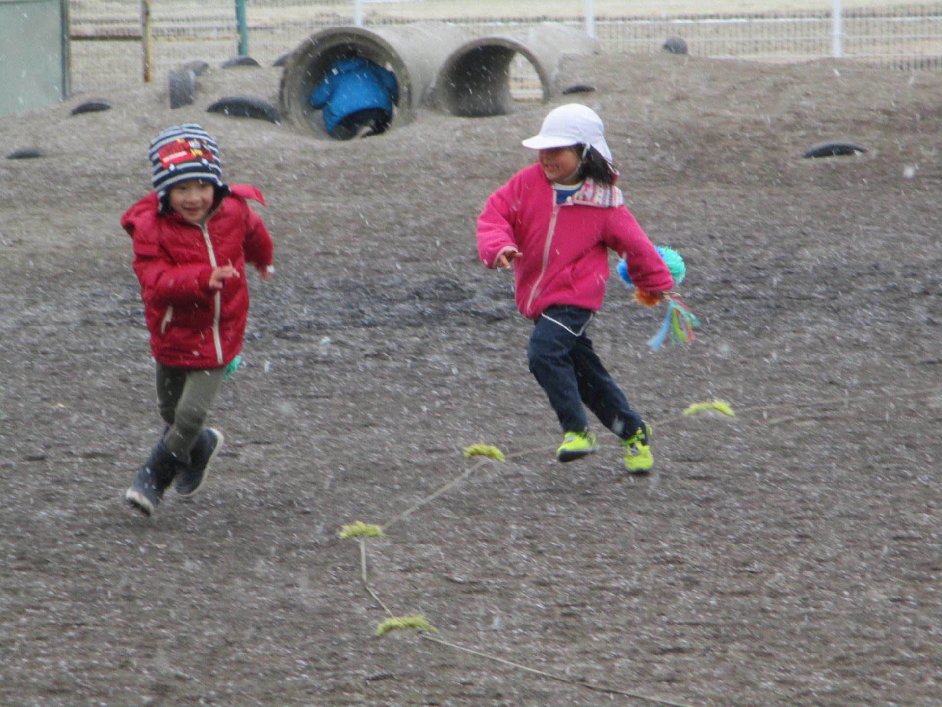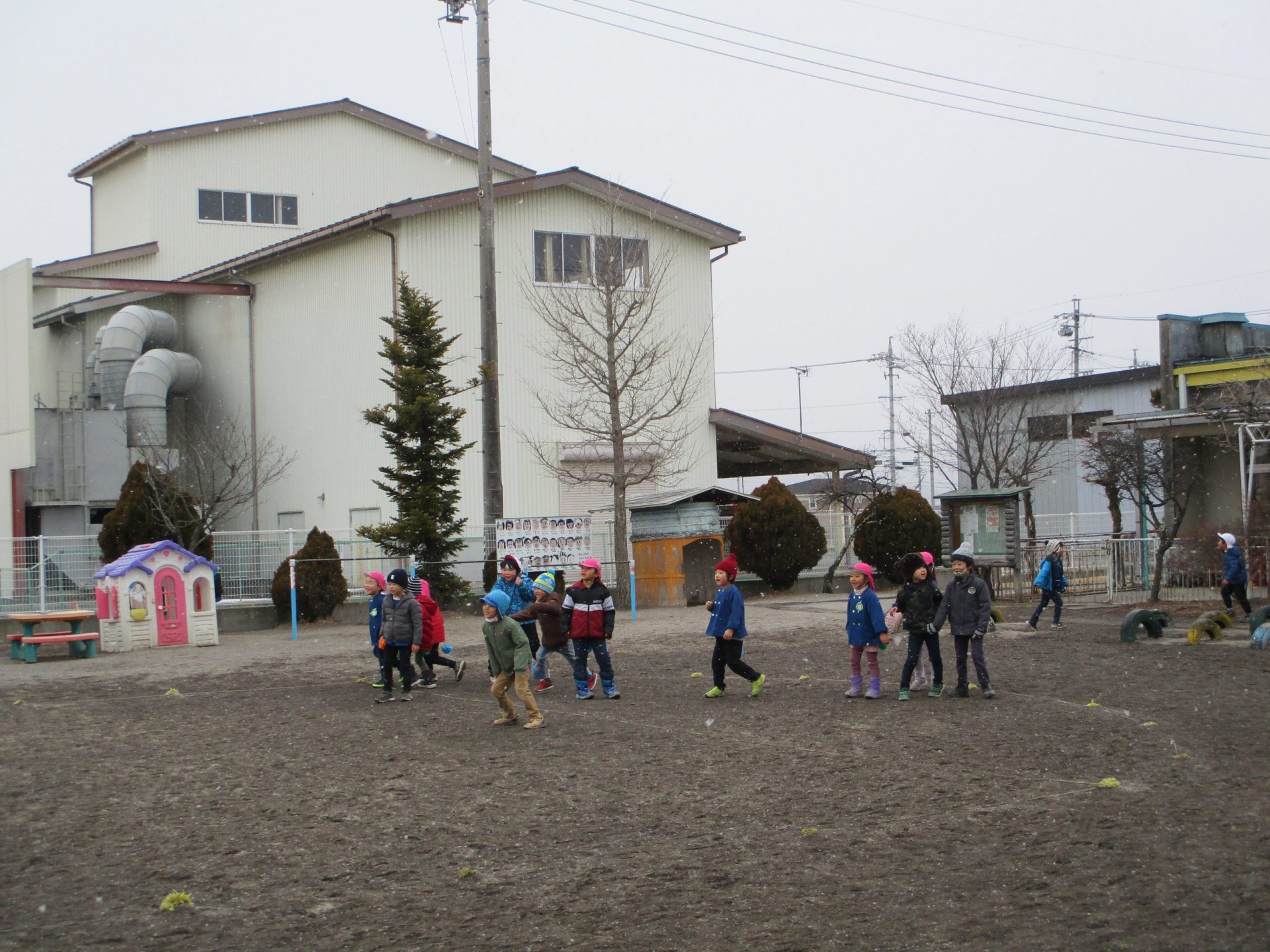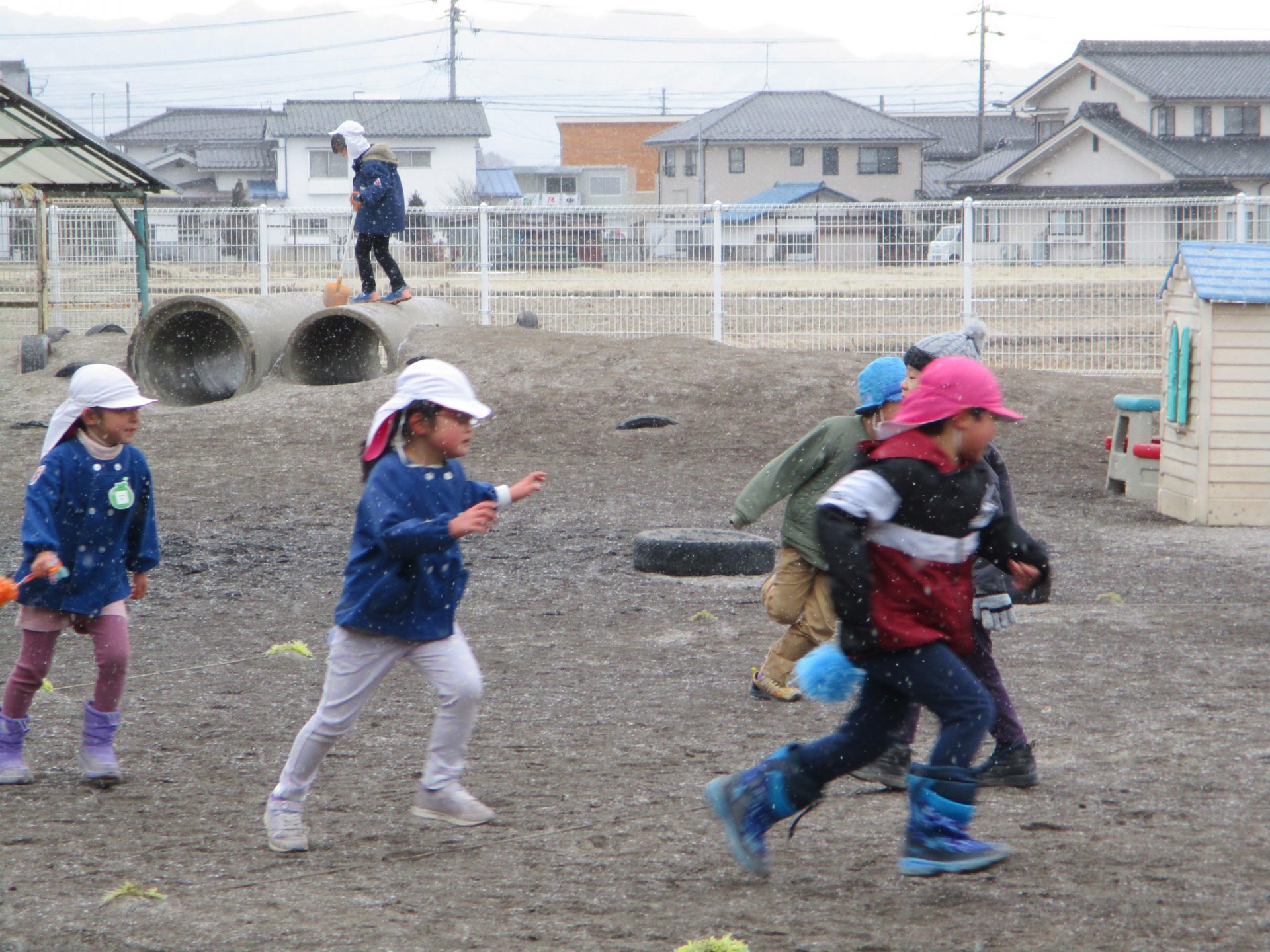 自由遊びの時間に、雪が降り始めました。