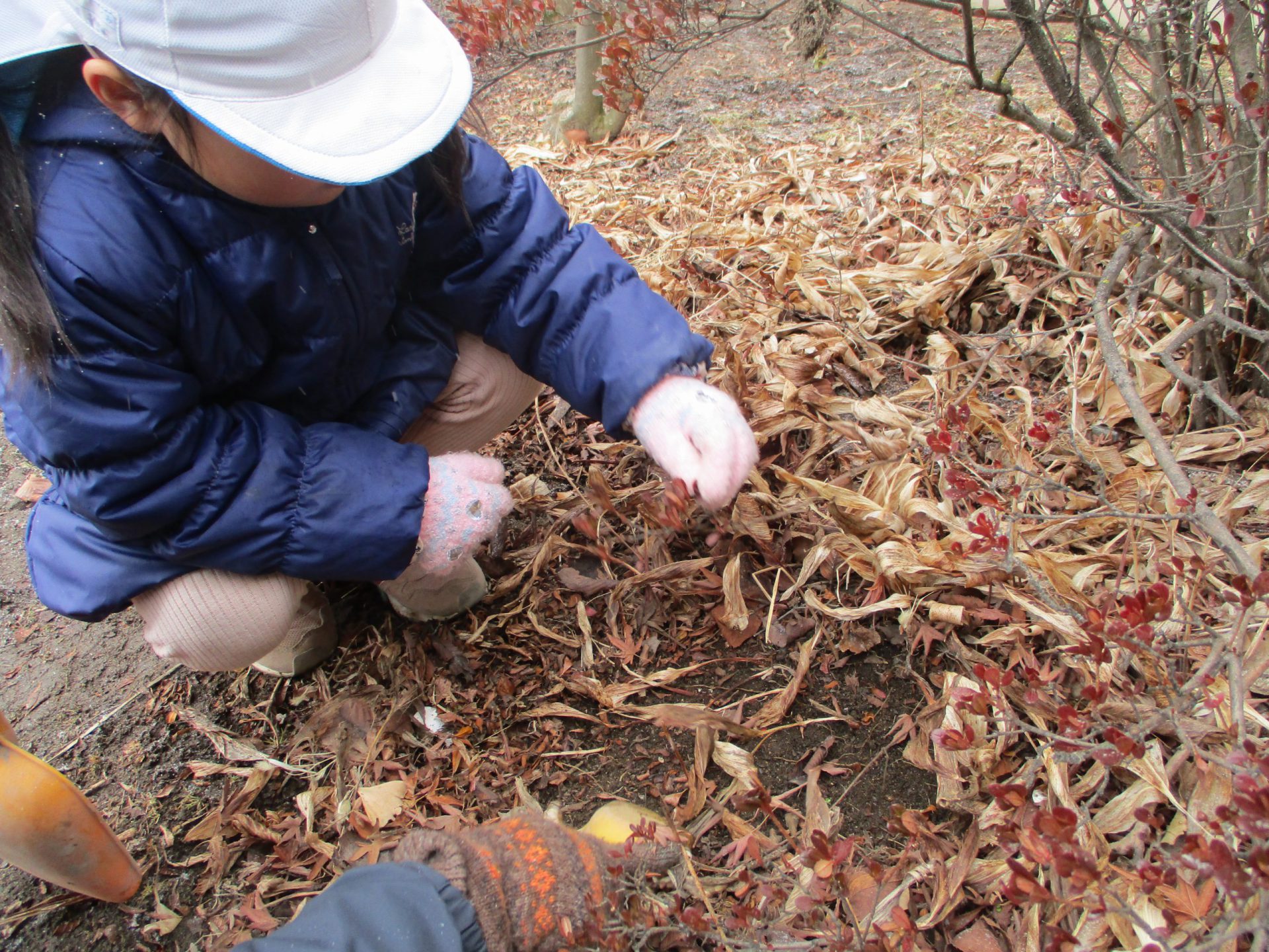 先生と一緒に、落ち葉の下を掘っている子がいました。