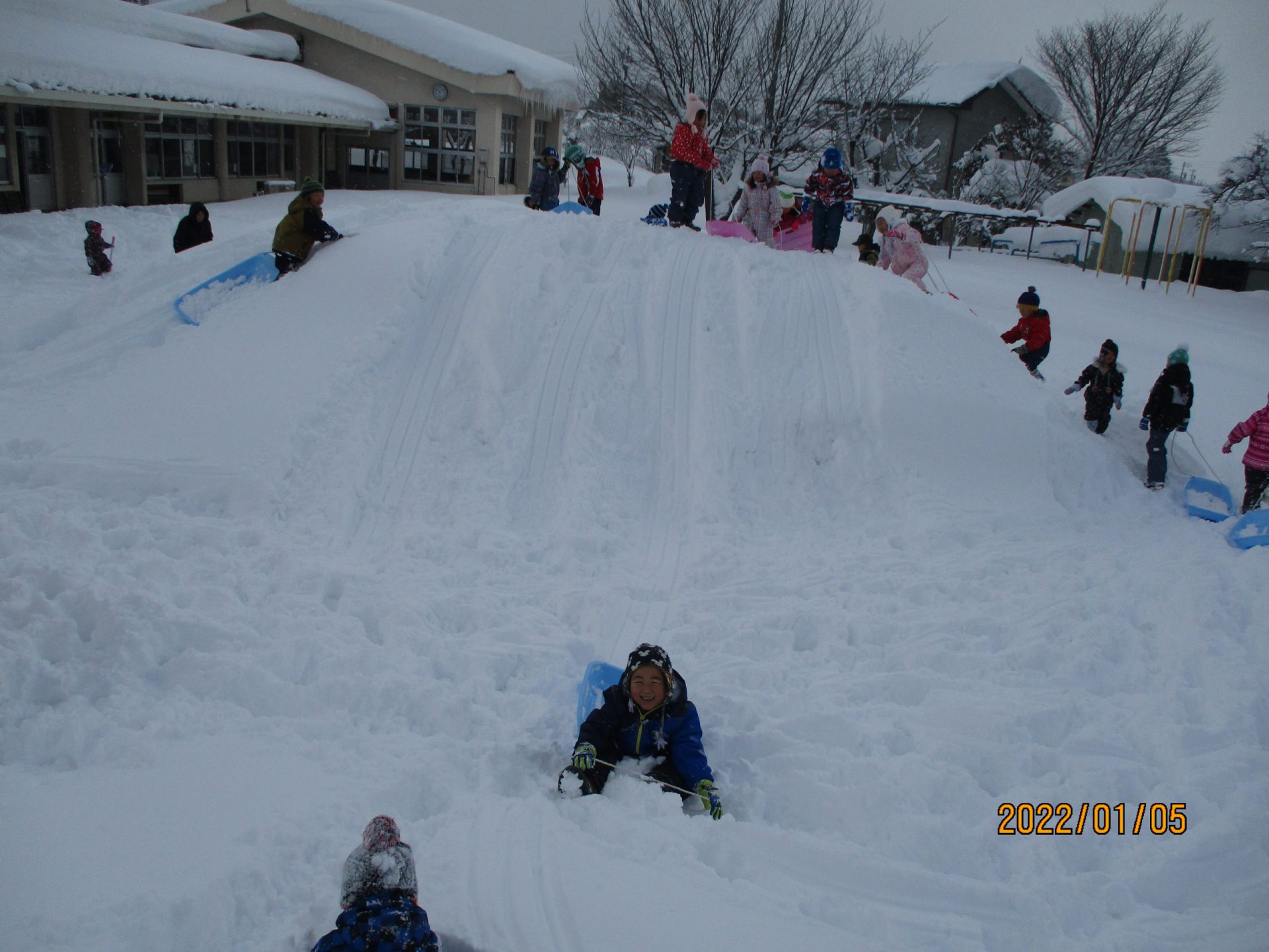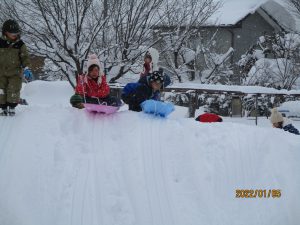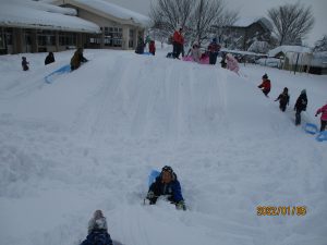 早速できた雪山で、そりやおしりすべりを楽しむ子どもたち。