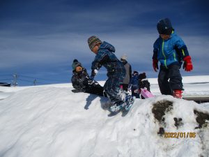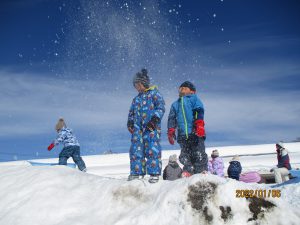 そり遊びの時、「ふわふわ雪だとゆっくりなんだよ」「遠くまで行けない!」とのこと。何度も何度も滑ってる子どもたちの発見です。