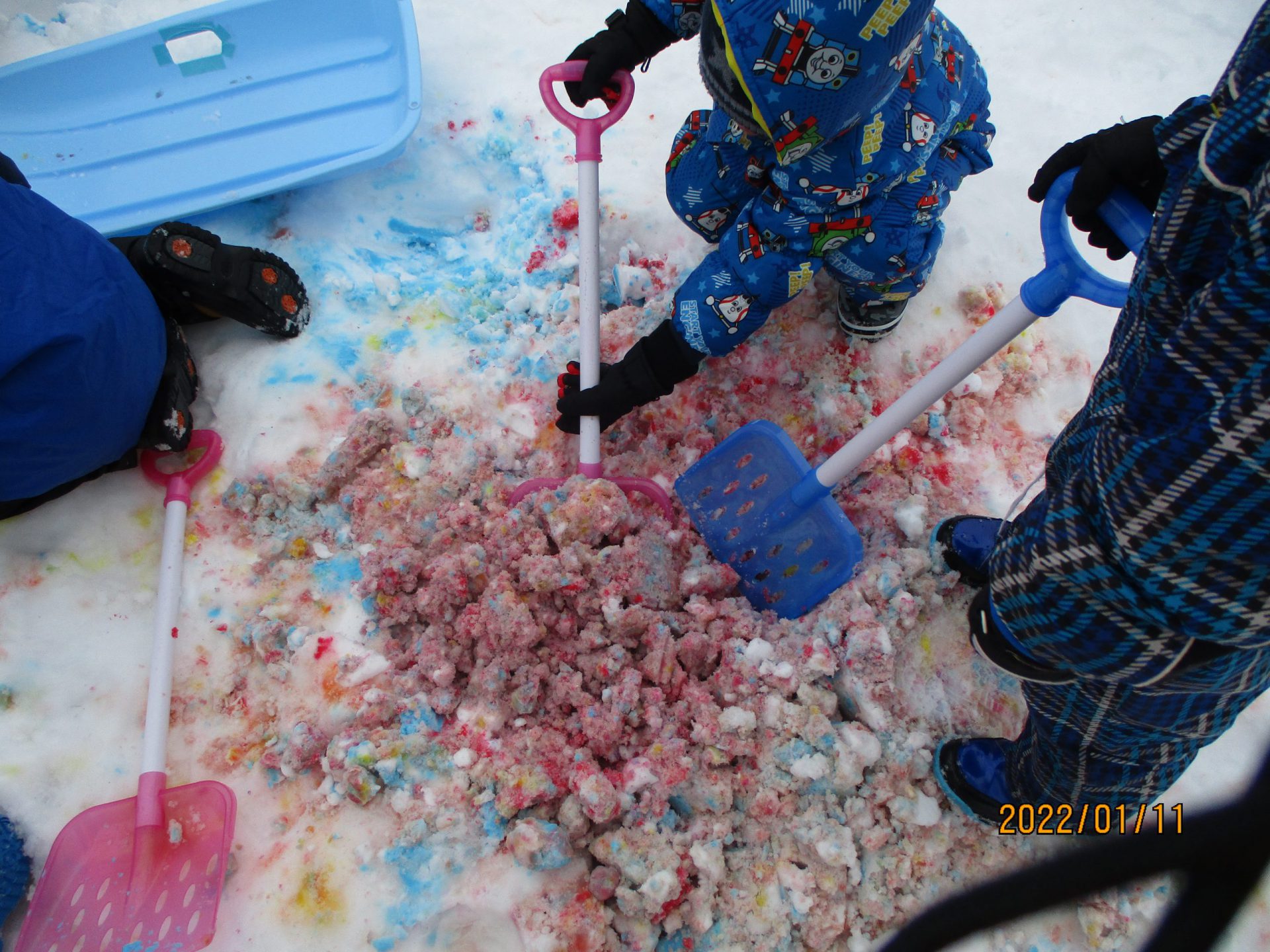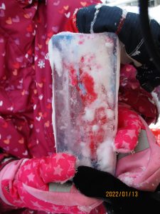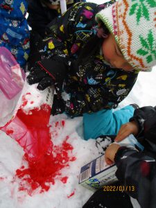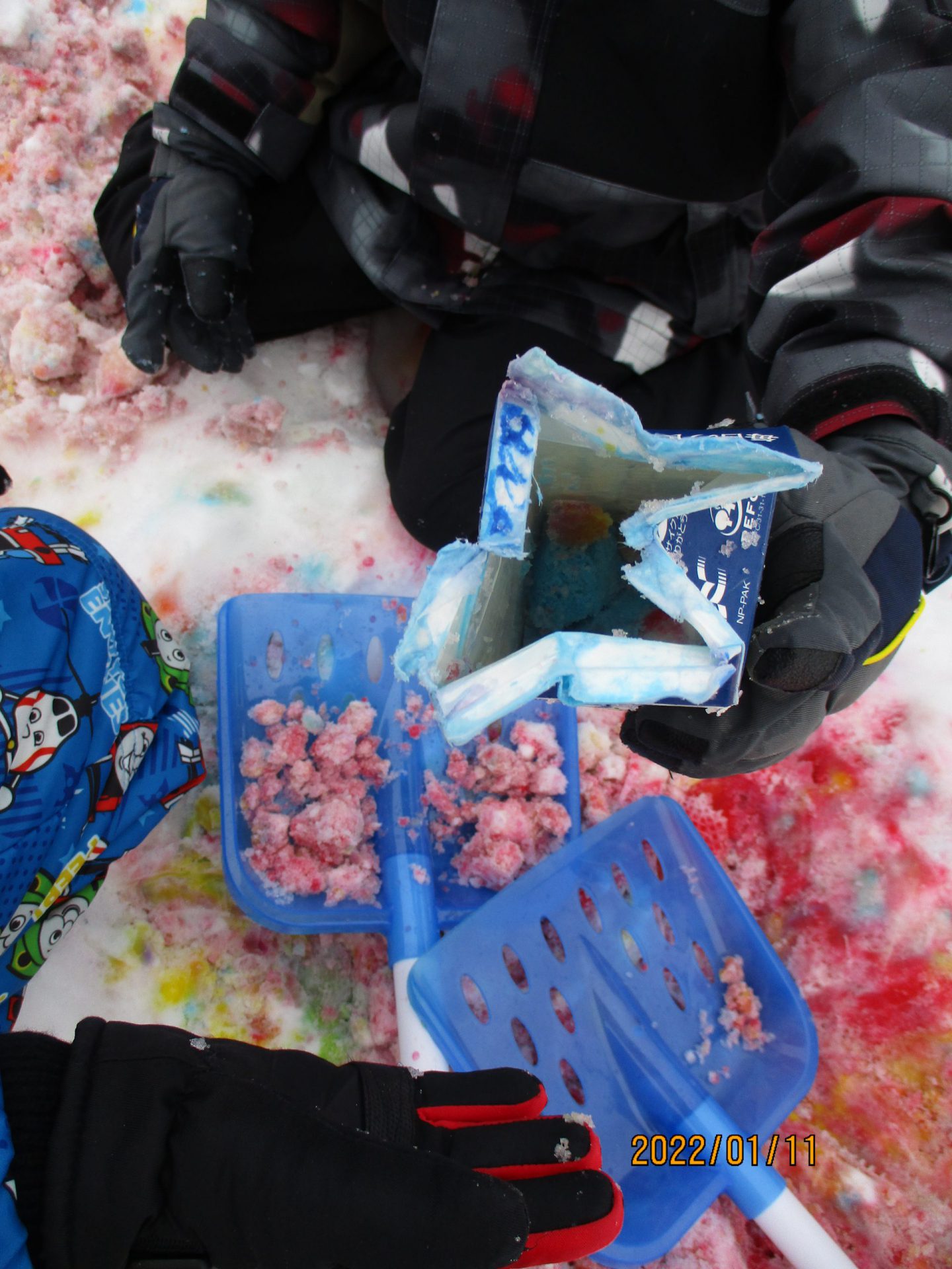 氷の中に雪を詰めるととっても綺麗で見惚れる子どもたちでした。