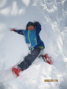 大雪ですぐに積もった雪を見て、「お外に行こう!!!」と大興奮。新雪の中をズボズボと歩いたり走ったり。子どもたちの体力に驚きます。