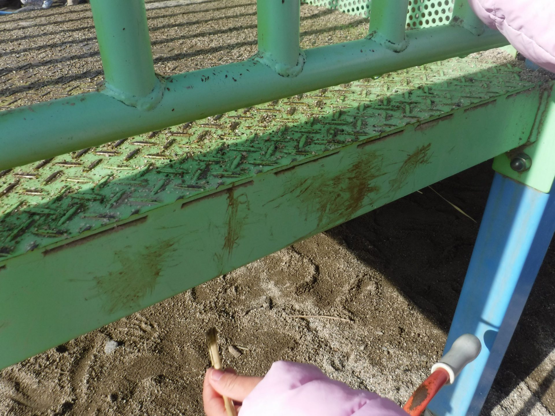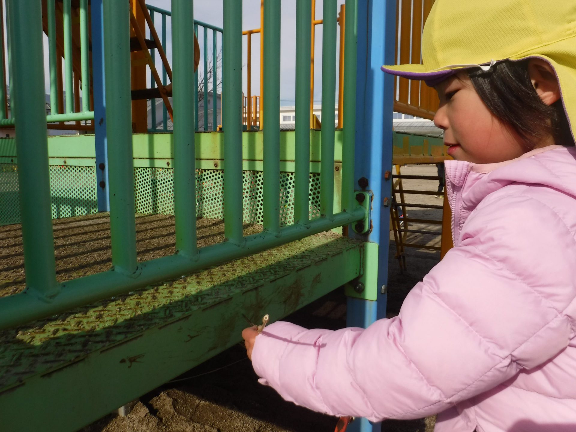 すべり台の壁に向かって、夢中で何かをする姿が・・・