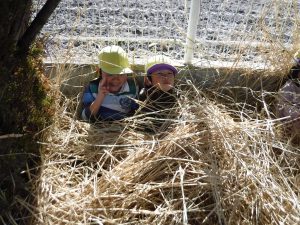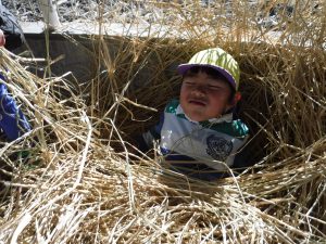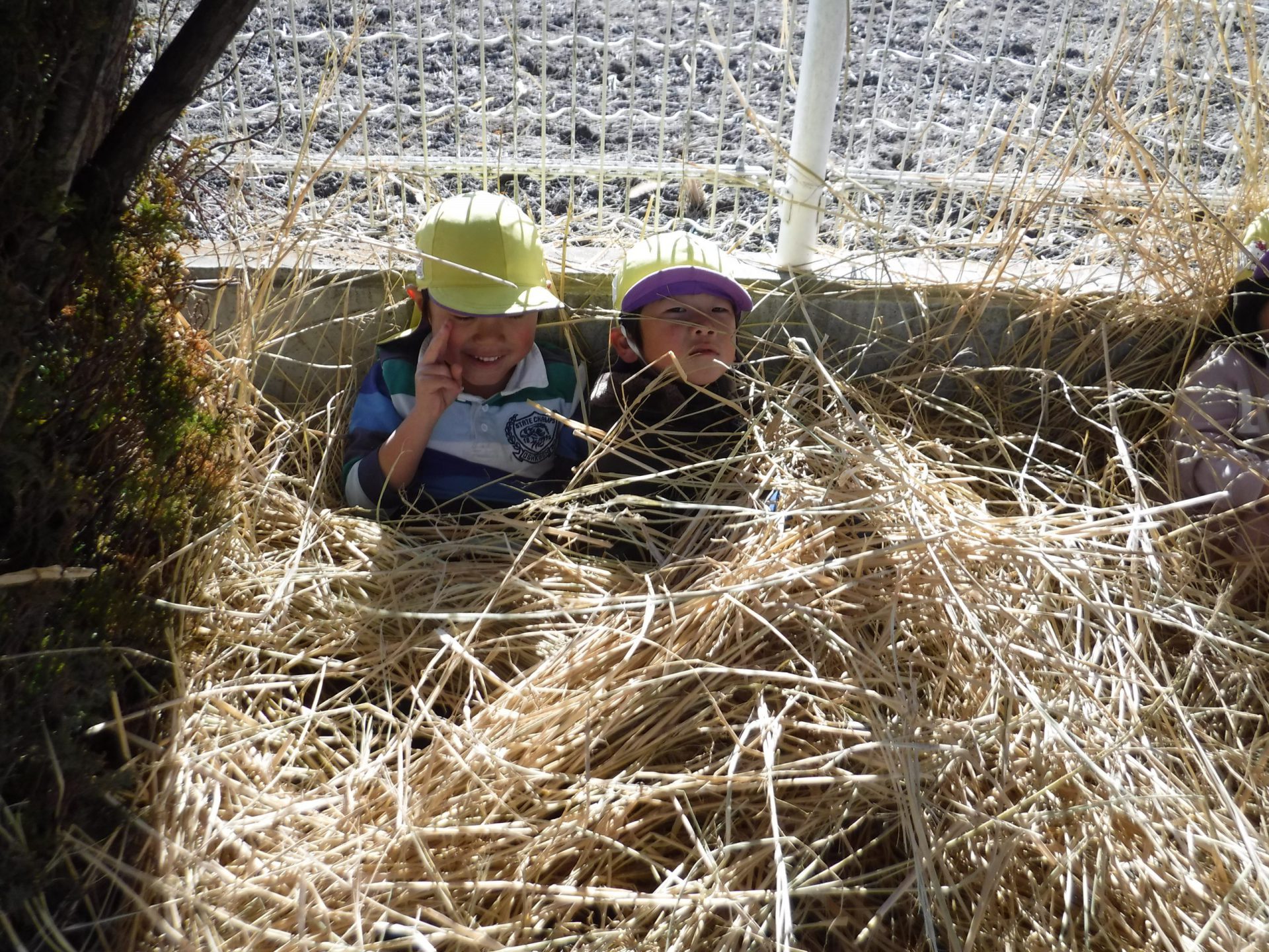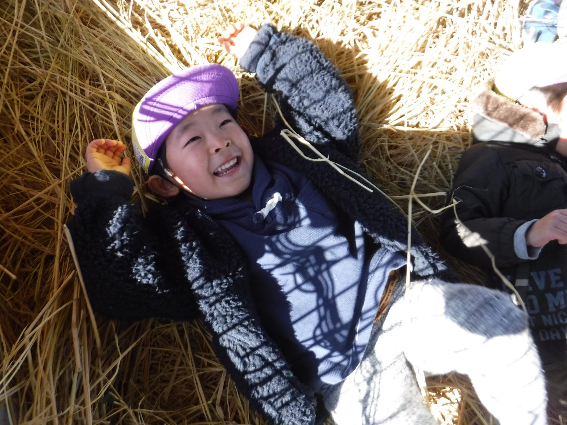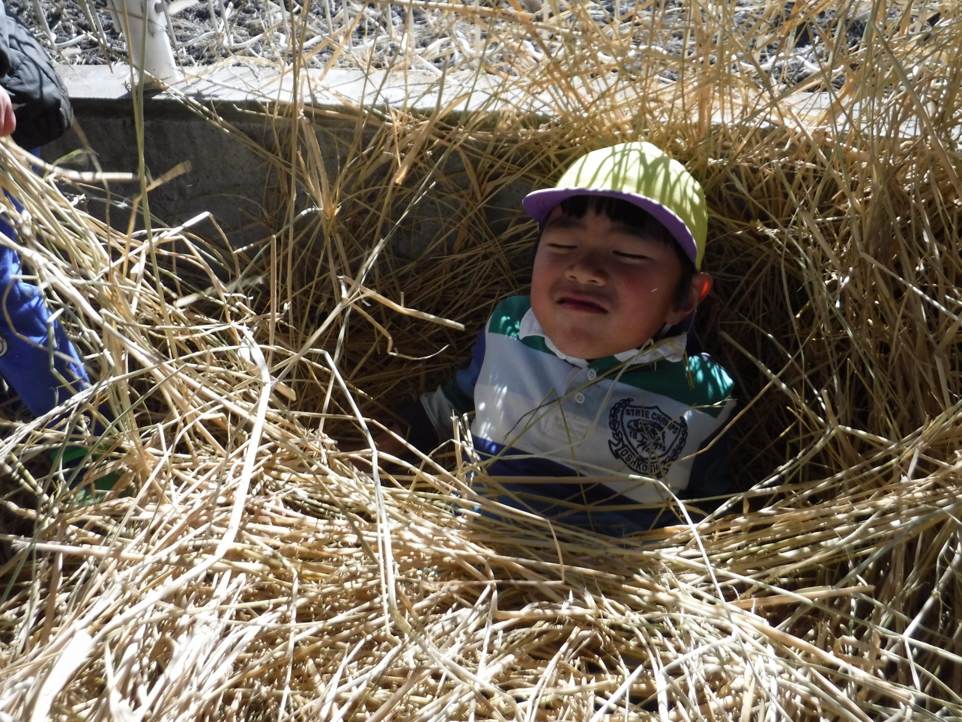 わらに潜り、あたたかさ、やわらかさを味わっています。