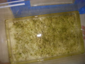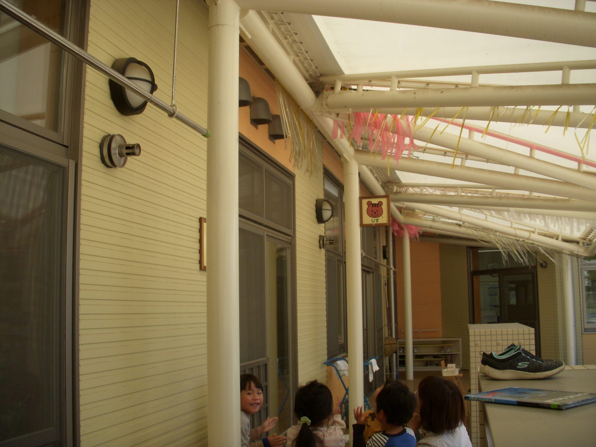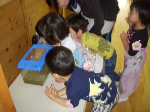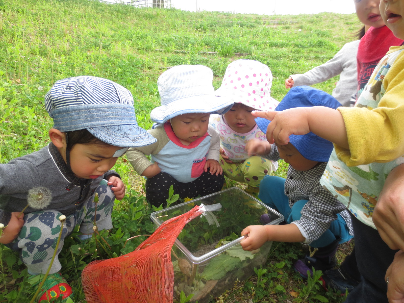 「これ、なあに?」「この小さくて黒いつぶつぶなに。」初めて見る不思議な物に興味津々の子ども達「カエルの卵だよ。」「じゃあ、おたまじゃくしの卵じゃん。」「いっぱいあるね。」「おたまじゃくしはカエルになるんだよ。」卵を見ながらの会話は楽しい内容でした。
