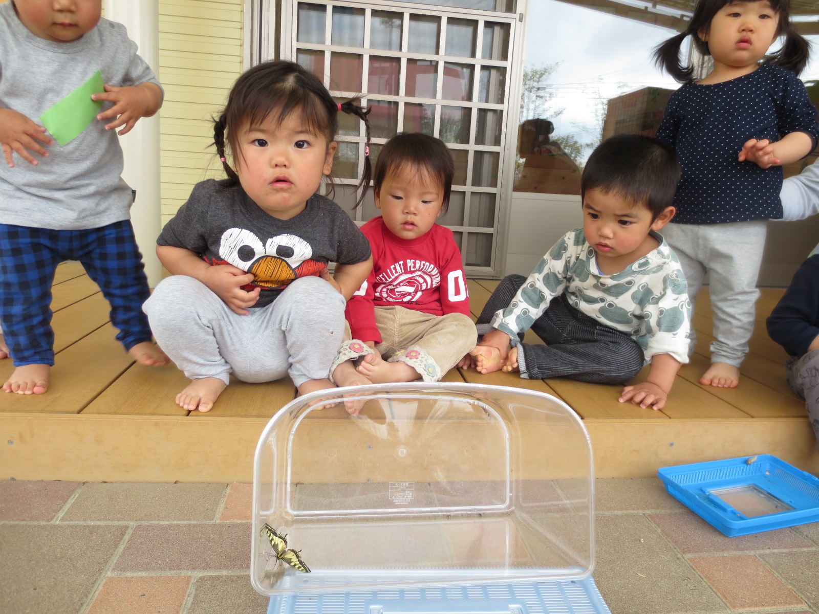 0.1歳児が昨年散歩へ出かけ発見したかまきりの卵!! 暖かい春がきてたくさんの赤ちゃんが生まれました。じーっと見つめる1歳児の子どもたち、大きくなるように園の野原に開放です。「バイバイ」と片言であいさつ。草の上を歩くかまきりの赤ちゃんに指差しする様子を見て「元気でね。大きくなってね。」と保育士が代弁。