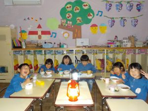 夕食が出来上がりました。保育園で収穫したさつまいも、地域の特産の小野子人参、お家で育てたパプリカを持って来てくれたお友だちもいて、地元のものがたくさん入った具だくさんカレーをもりもり食べます。電気を消してランタンの灯りで夜の雰囲気を楽しみました。