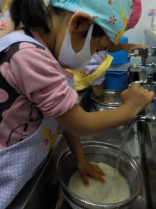 夕食作りのスタート。始めにお米を洗います。「水がつめたーい」「おうちでお手伝いしてるよ」と手際よく研いでいきます。
