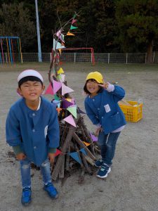 「倒れちゃうー」「どうしよう」「ひもでしばればいいんじゃない」と神社や園の目の前にある里山から拾ってきた薪を組み立てて、飾りを飾り付けキャンプファイヤーの準備をします。「きれいに飾れたー」と嬉しそうです。