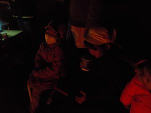 陽が落ちて外はすっかり暗闇となりました。「お布団に寝転んで星が見たい!」と飼料袋に新聞紙を詰め込んだお手製のお布団に寝転んで夜空を見上げます。あいにくの曇り空でしたが雲の合間から見える星を見つけて「きれーい」と嬉しそう。寒さも忘れて見上げていました。