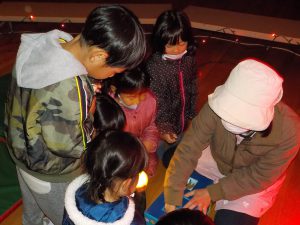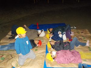 年長児6人が自分の思いを伝え友達の思いにも耳を傾け考え合い、力を合わせながら準備を進めてきました。やりたい事を実現する為にどんな物が必要なのか考えアイデアを形にしていく面白さを感じる事ができました。夜の保育園という特別な場所と時間で、少しずつ辺りが暗くなっていく様子に気付いたり、たき火の火の暖かさを感じたり、真っ暗な空に光る星のきれいさに気付いたりしながら仲間と一緒に嬉しい!楽しい!を体全体で表しながら素敵な1日を過ごすことができました。思い出をいつまでも忘れないでいて欲しいです。