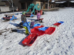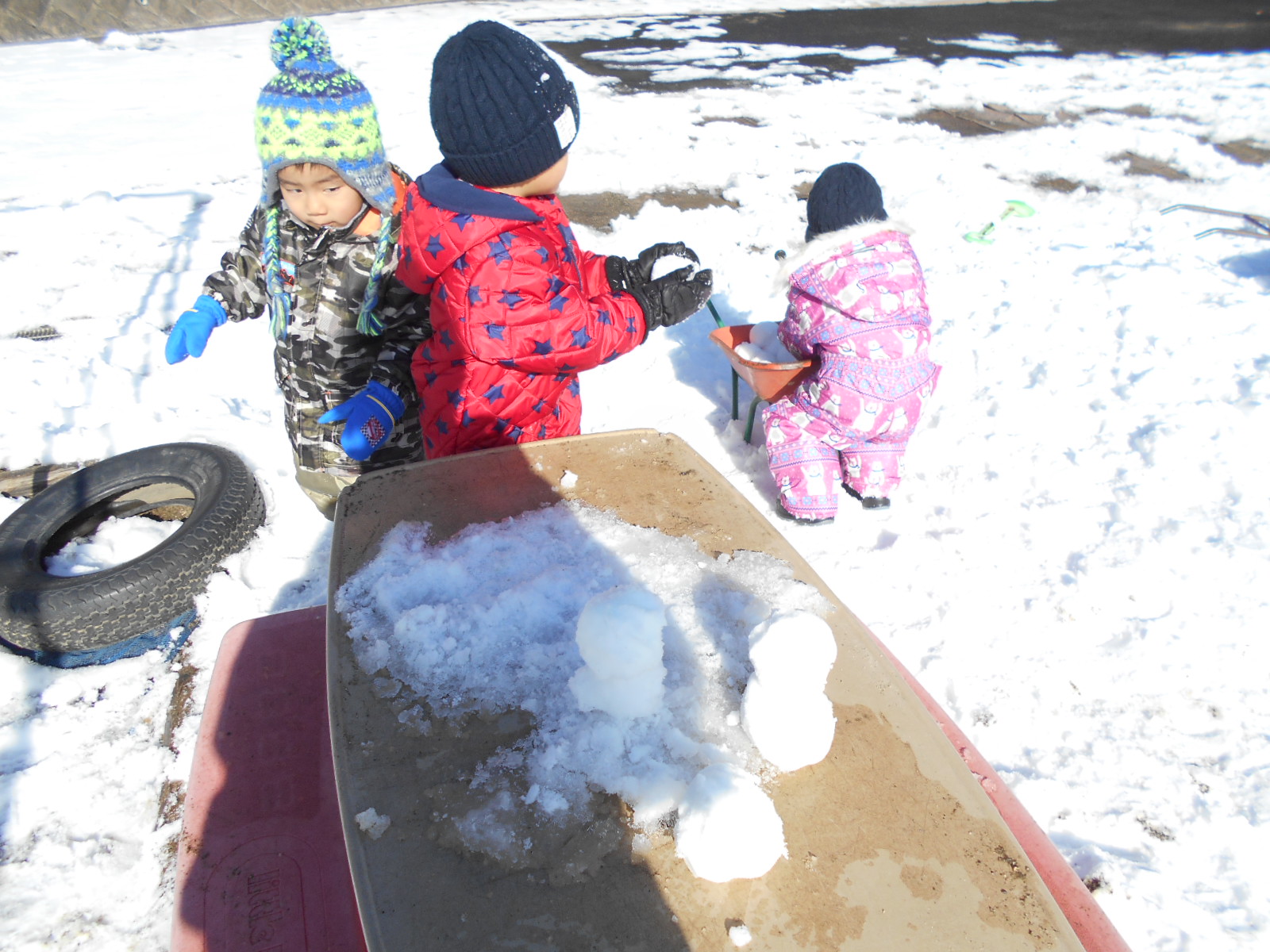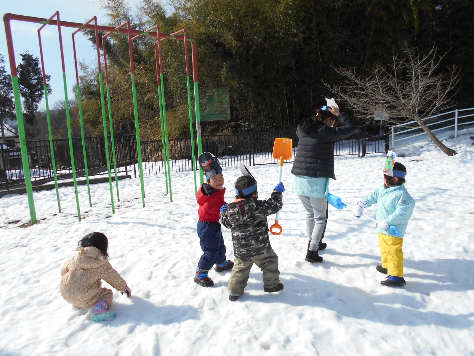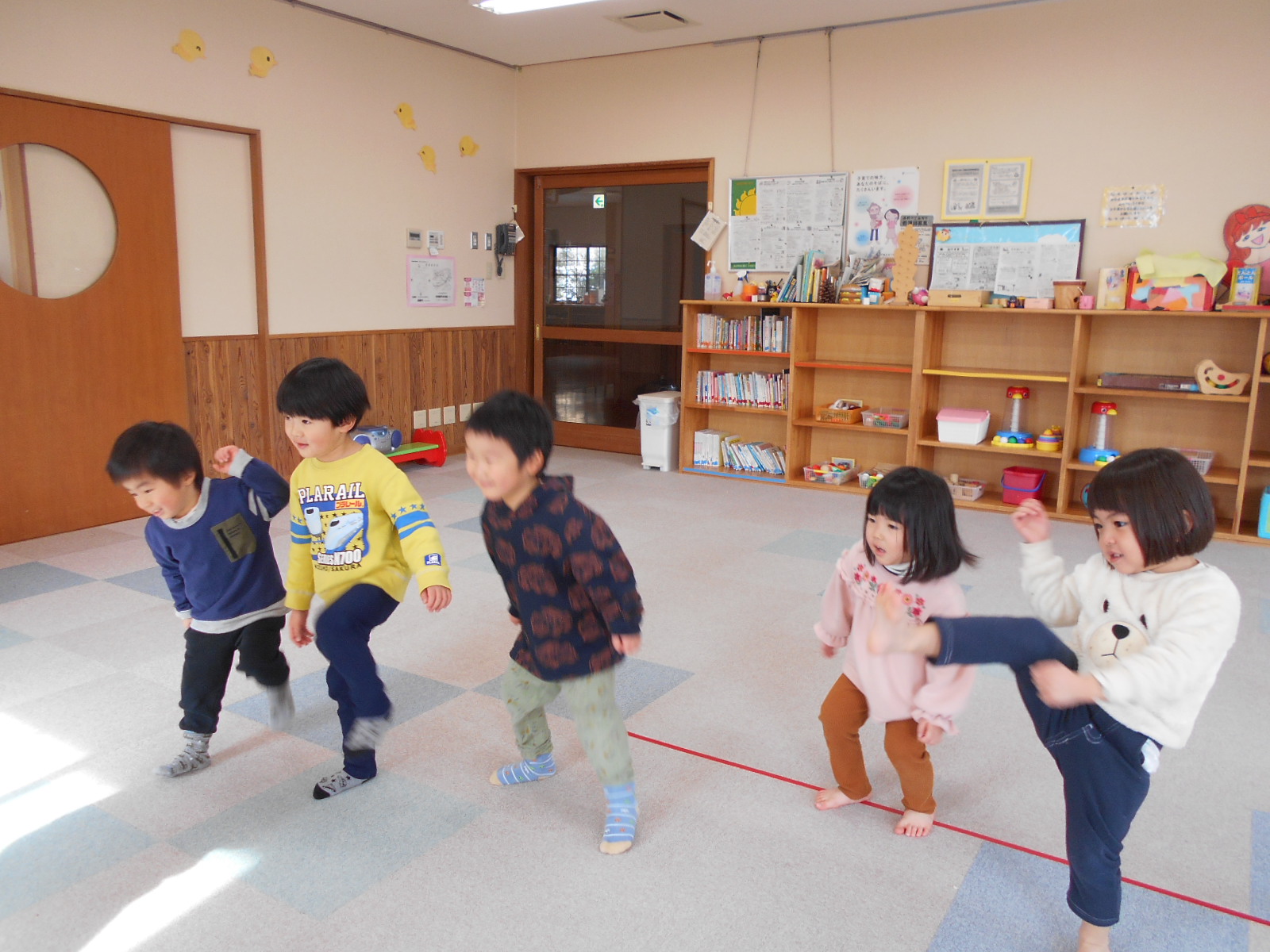 雪遊び、伝統行事の節分ごっこ、運動遊び 子どもたちが自分なりに感じたこと、わくわく感を日々の中で大切にしています。「~しよっか!」と保育士からではなく、子どもたちからそんな言葉が聞かれるのが嬉しいです。2歳児なりに自分で考えて行動する主体性を見守り、一人一人の育ちを支えています。