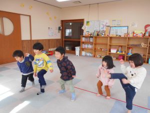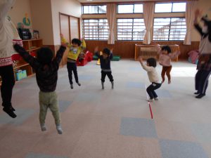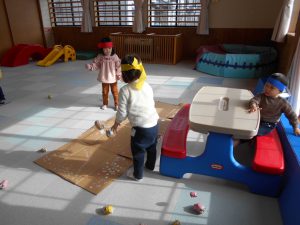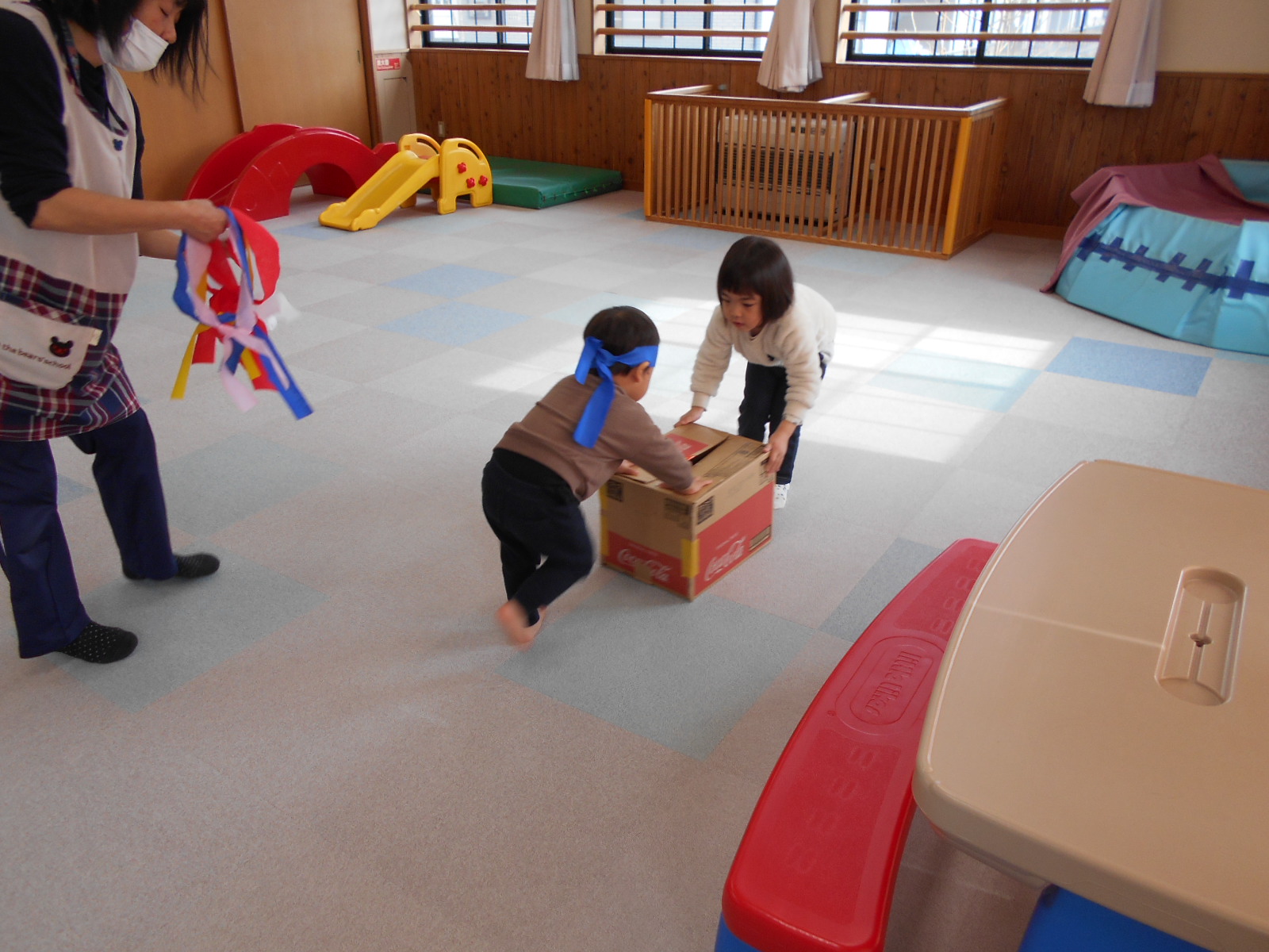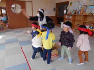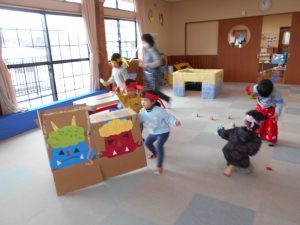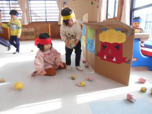 写真にもありますが、節分ごっこでは遊んだ後の片づけを自然に行う姿があり、「遊びに満足できたのかな」と思えた瞬間でした。