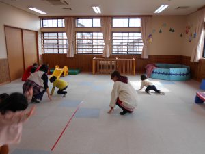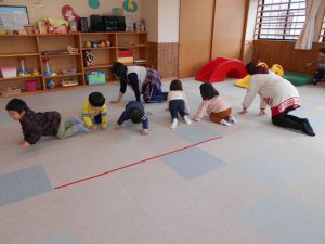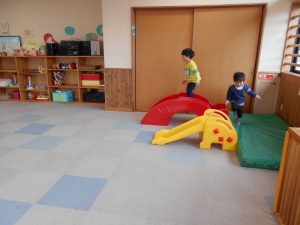 運動遊びは、継続して取り組んでいますが、音楽を聞いて楽しく体をのびのびと動かすことを願いながら遊んでいます。途中でシュ!と滑り台を滑って、また運動遊びをしたり。「楽しい」「やりたい」は一つには絞れず、いろいろ遊ぶ姿が2歳児です。それぞれの子どもたちの姿に個性が見られとてもかわいいです。