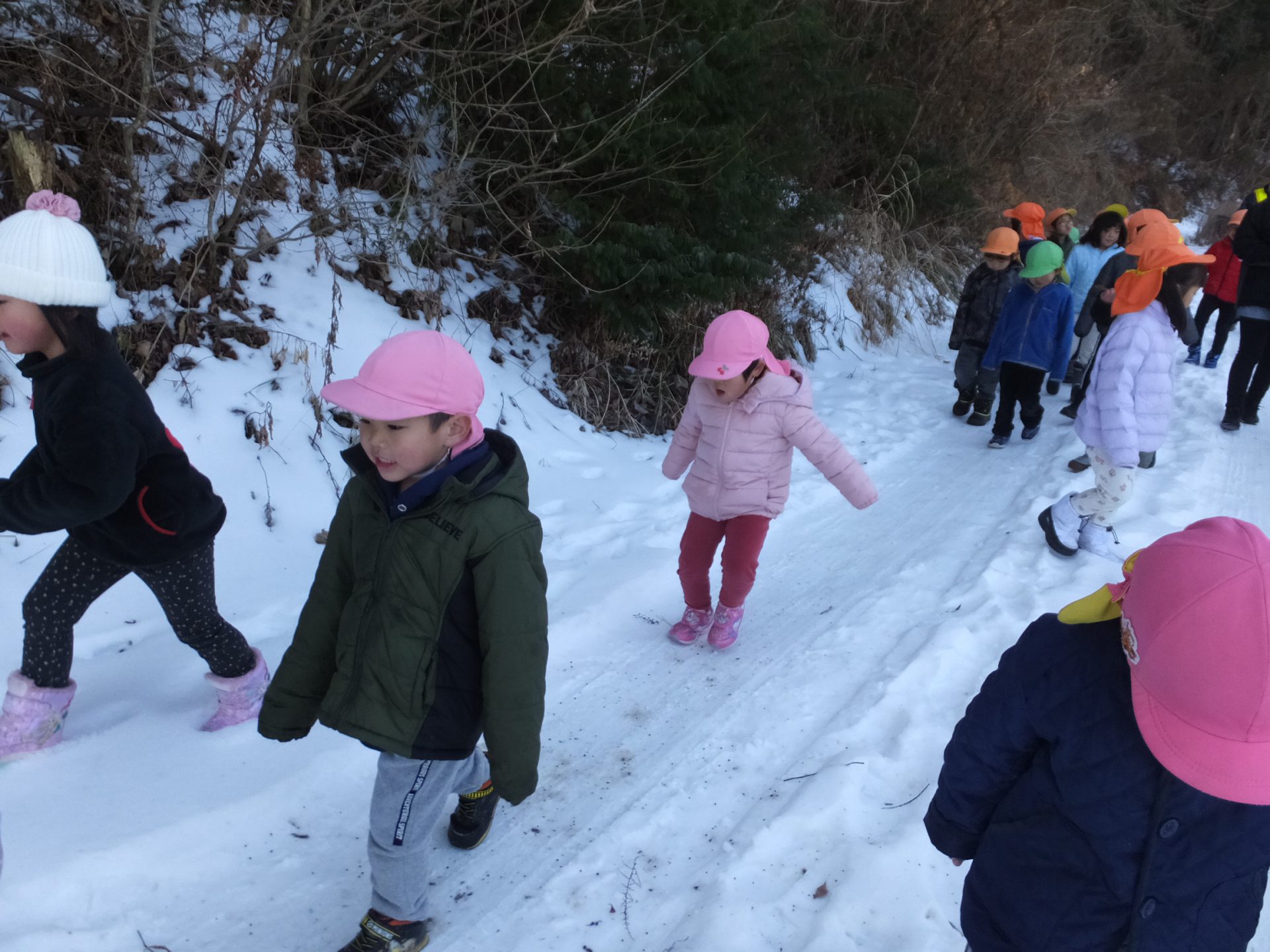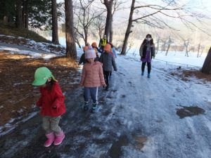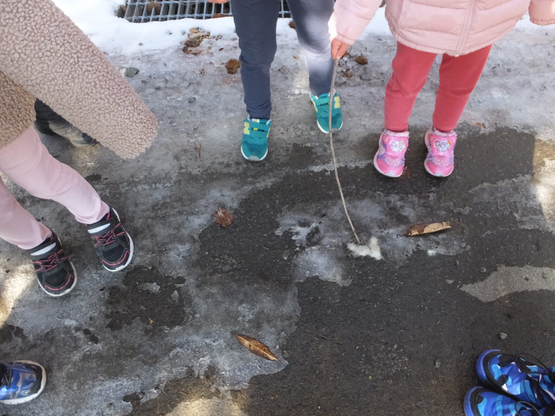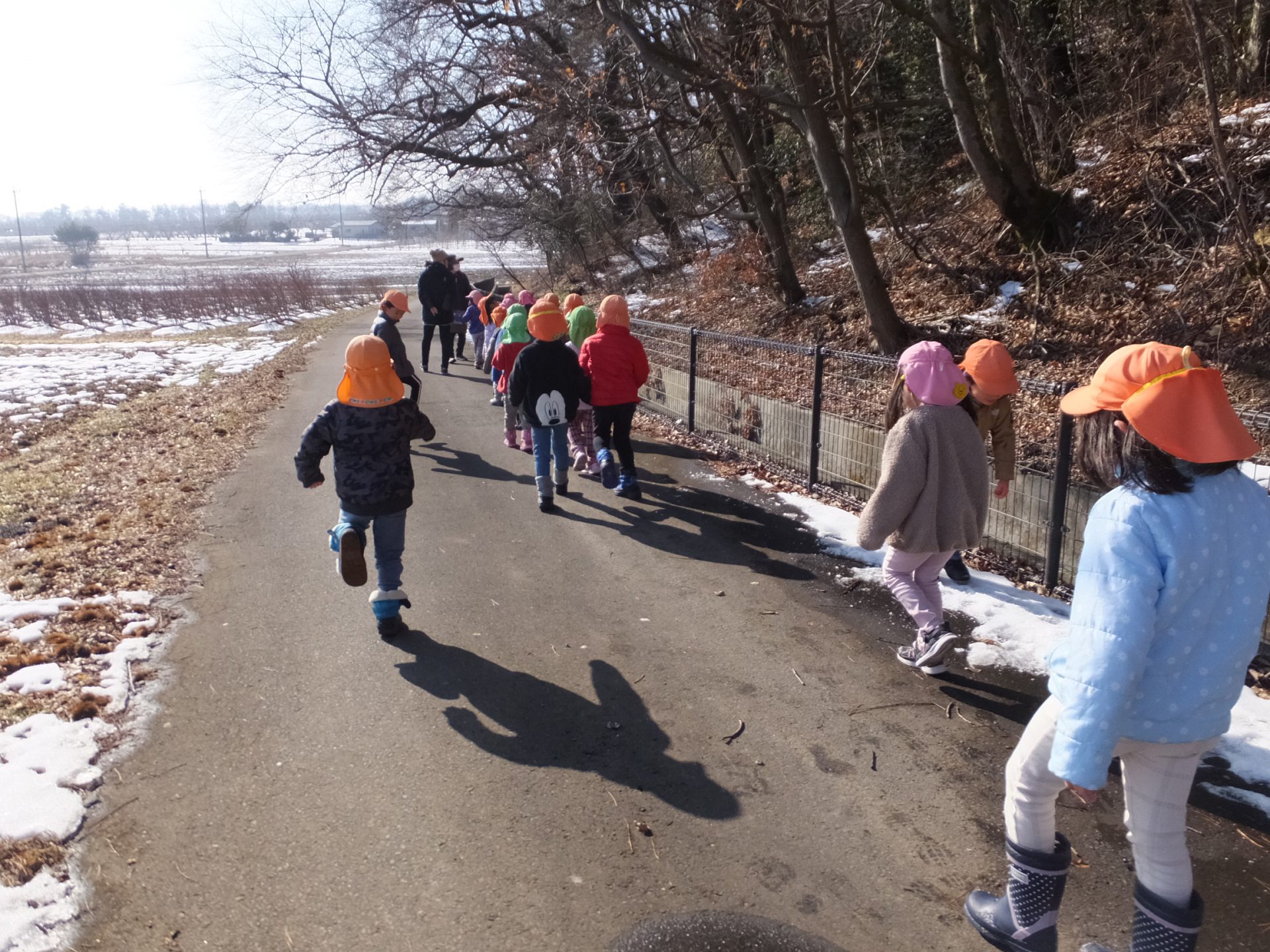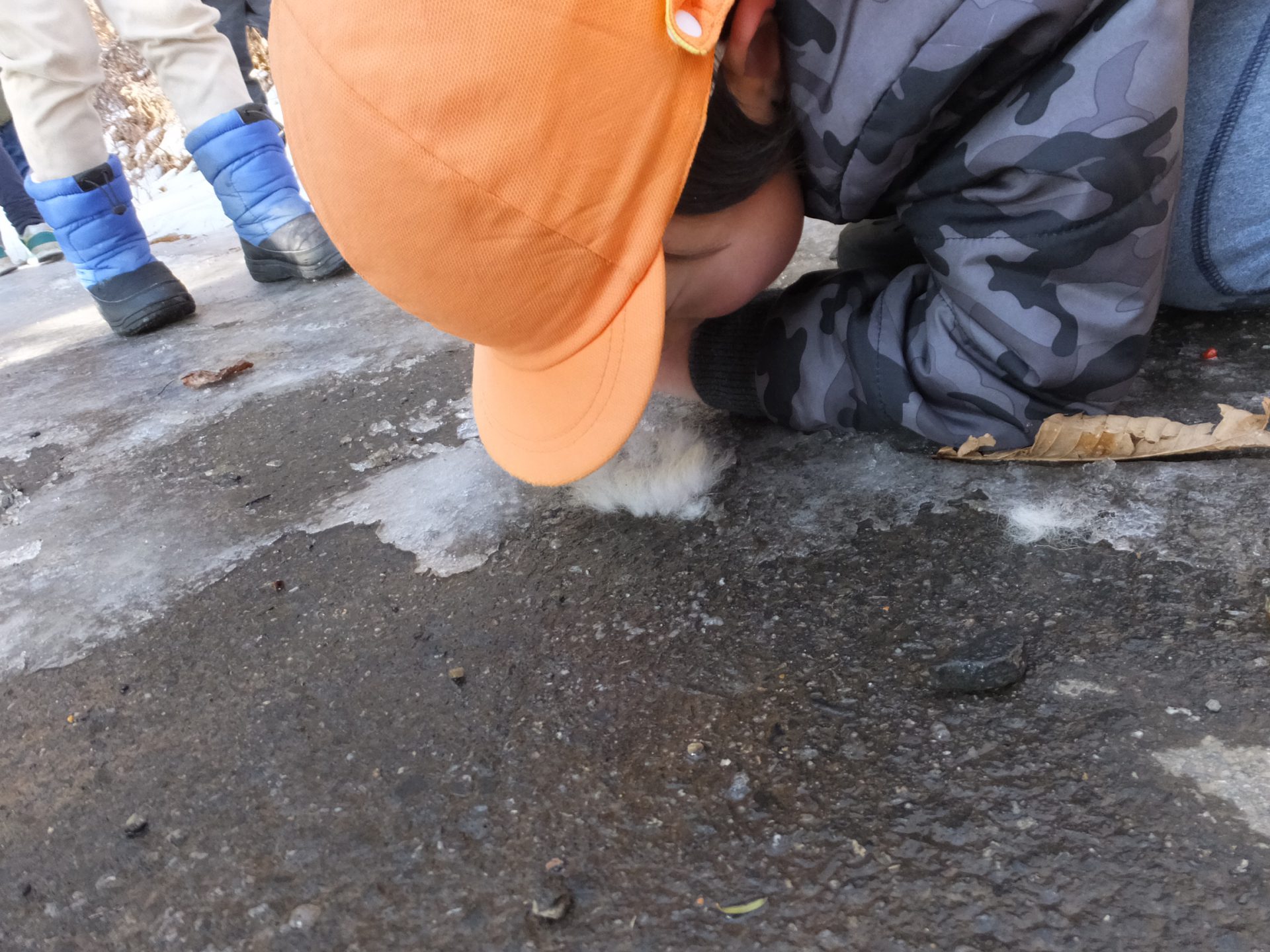 毎日厳しい寒さが続いていましたが、久しぶりのおだやかな日。子ども達も「久しぶりだねー」と嬉しそうでした。いつもの散歩コースだけど、季節が変わると発見もいっぱいです。冬らしい寒さや自然の面白さ、不思議さに子ども達と一緒に関わり、そして時折感じる暖かさにほっこりしながら、のんびりと出かけて来ました。