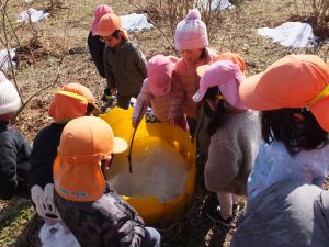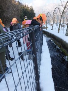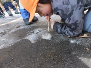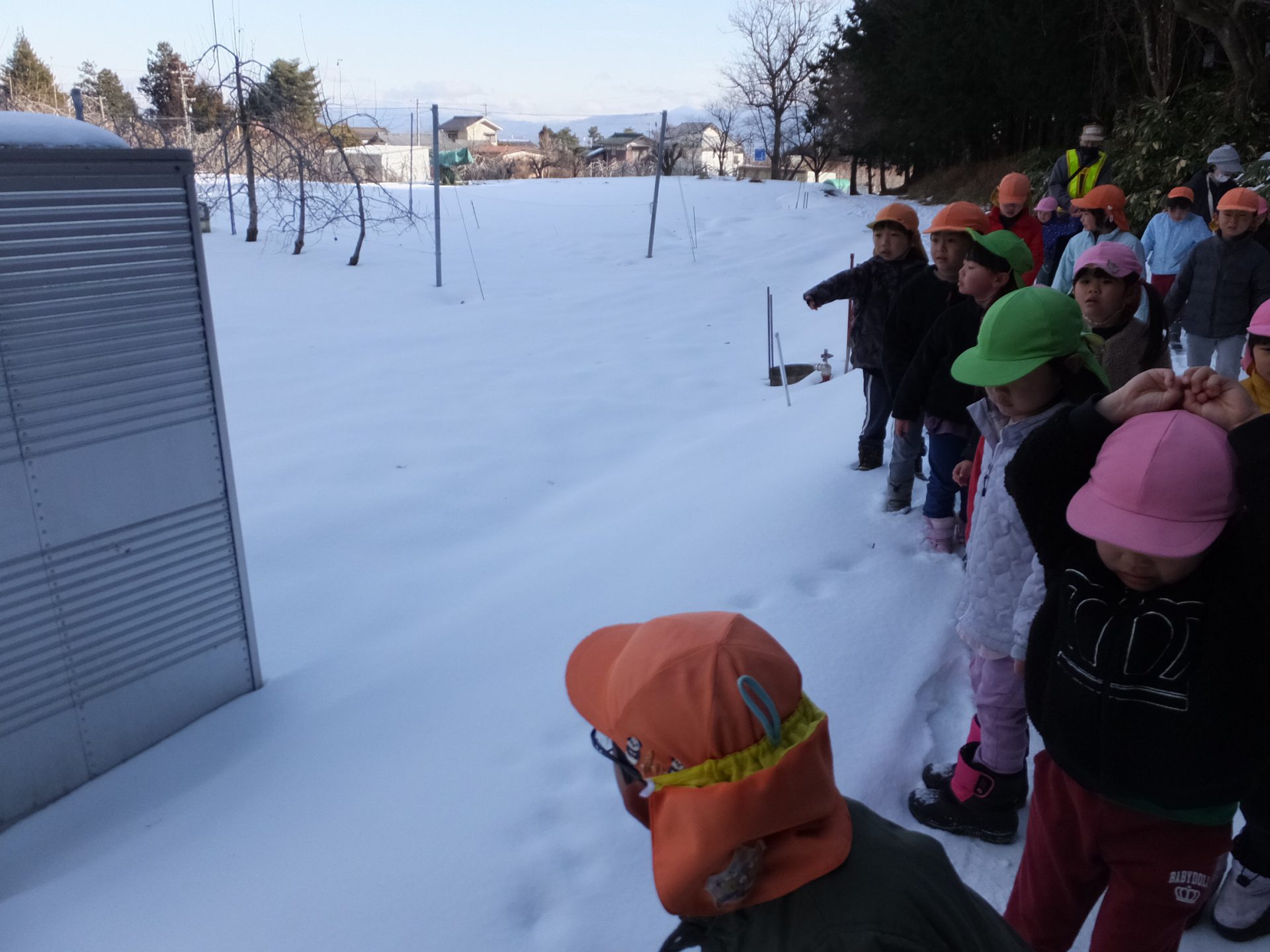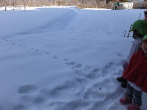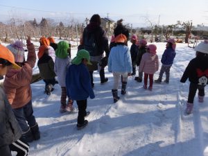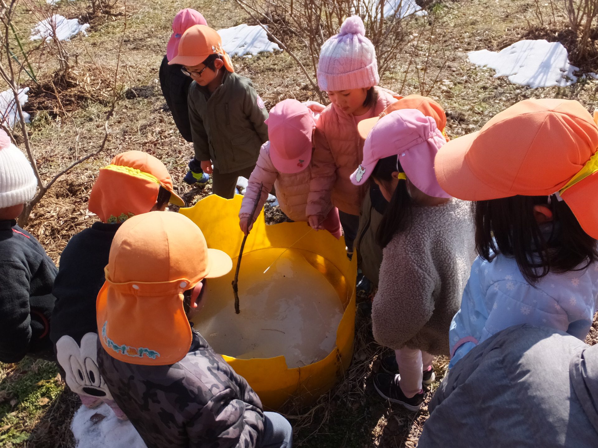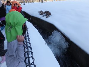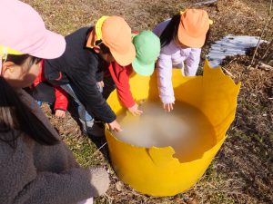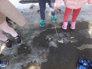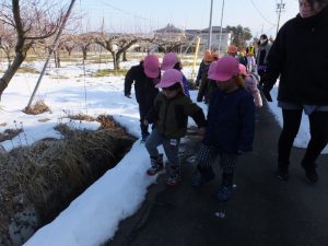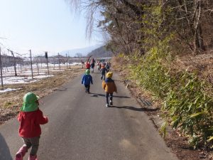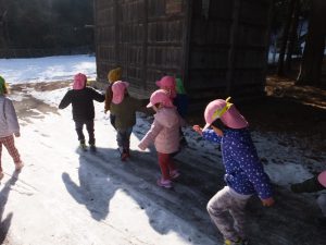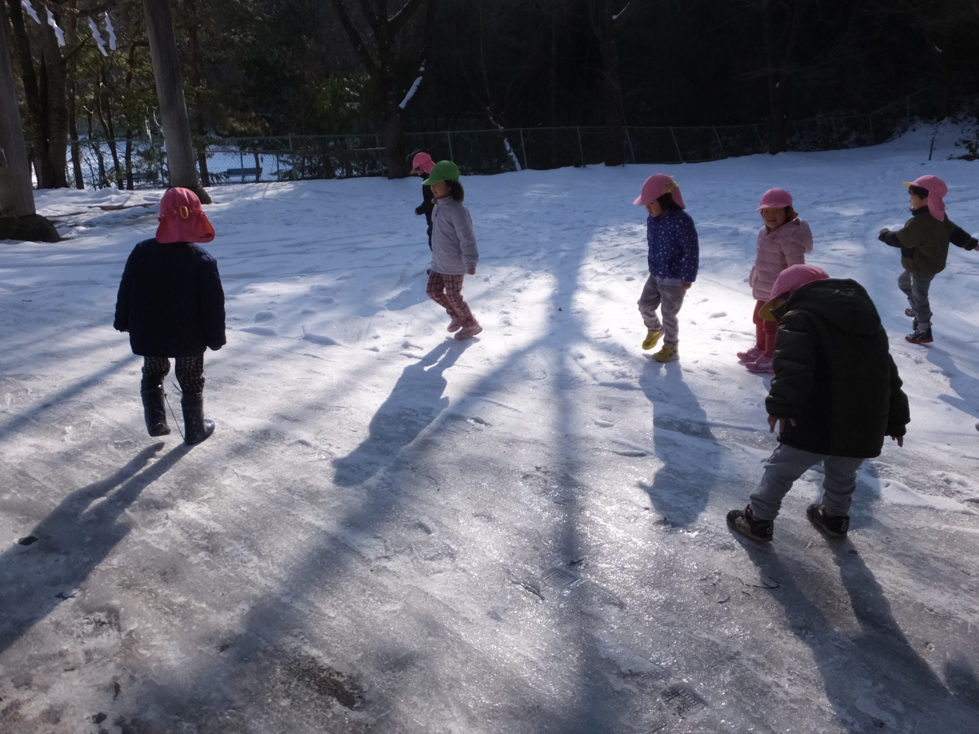 毎日厳しい寒さが続いていましたが、久しぶりのおだやかな日。子ども達も「久しぶりだねー」と嬉しそうでした。いつもの散歩コースだけど、季節が変わると発見もいっぱいです。冬らしい寒さや自然の面白さ、不思議さに子ども達と一緒に関わり、そして時折感じる暖かさにほっこりしながら、のんびりと出かけて来ました。