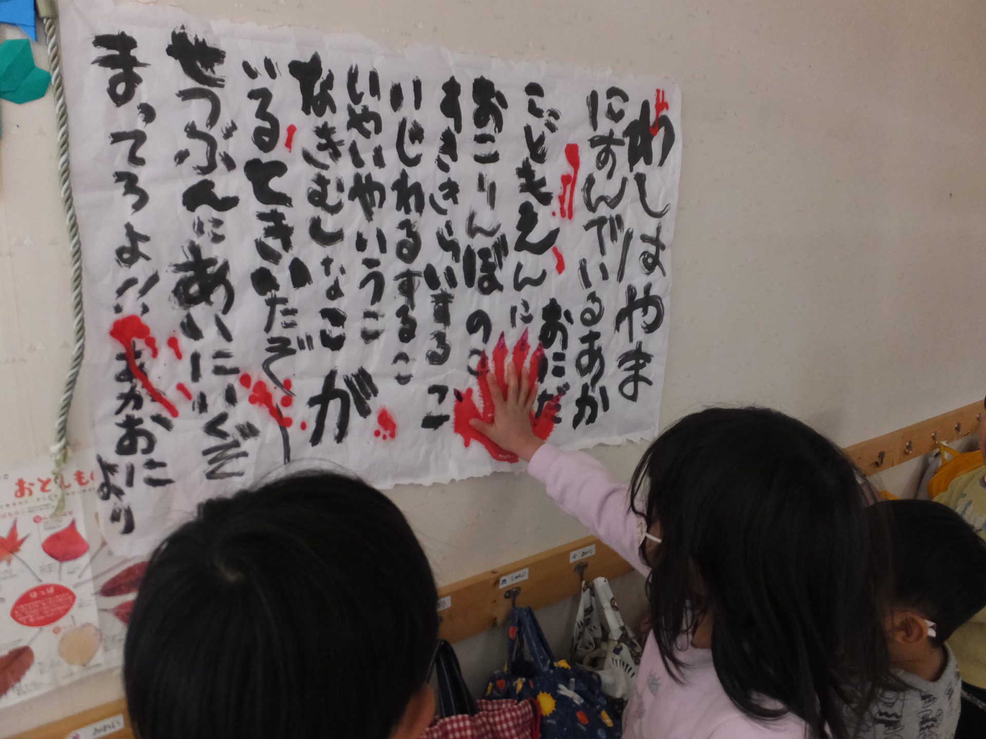 数日前・・・園に鬼からの手紙が届いていた為、いろんな物が鬼に見える子ども達です。