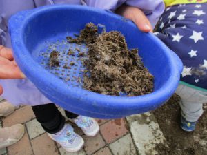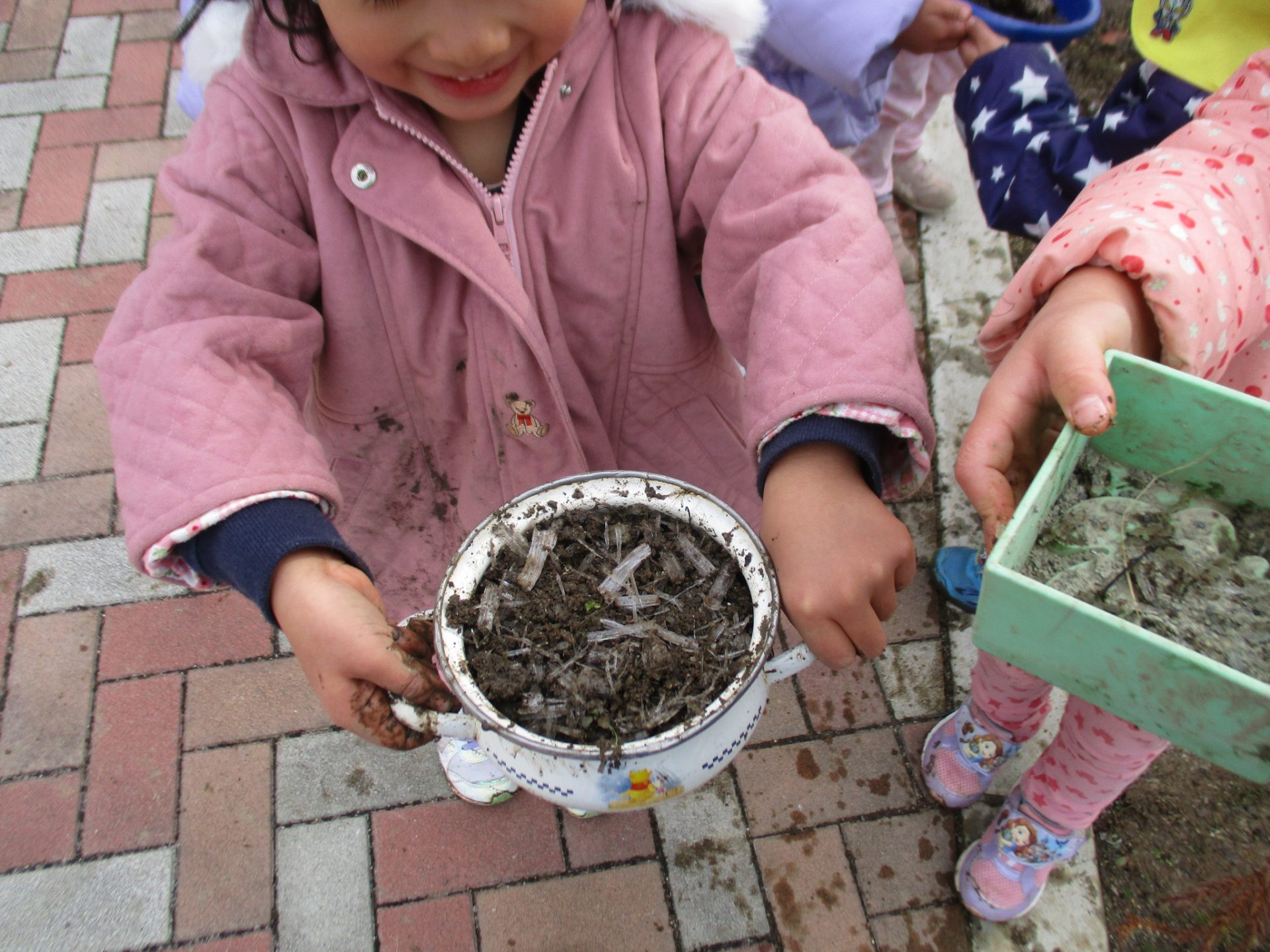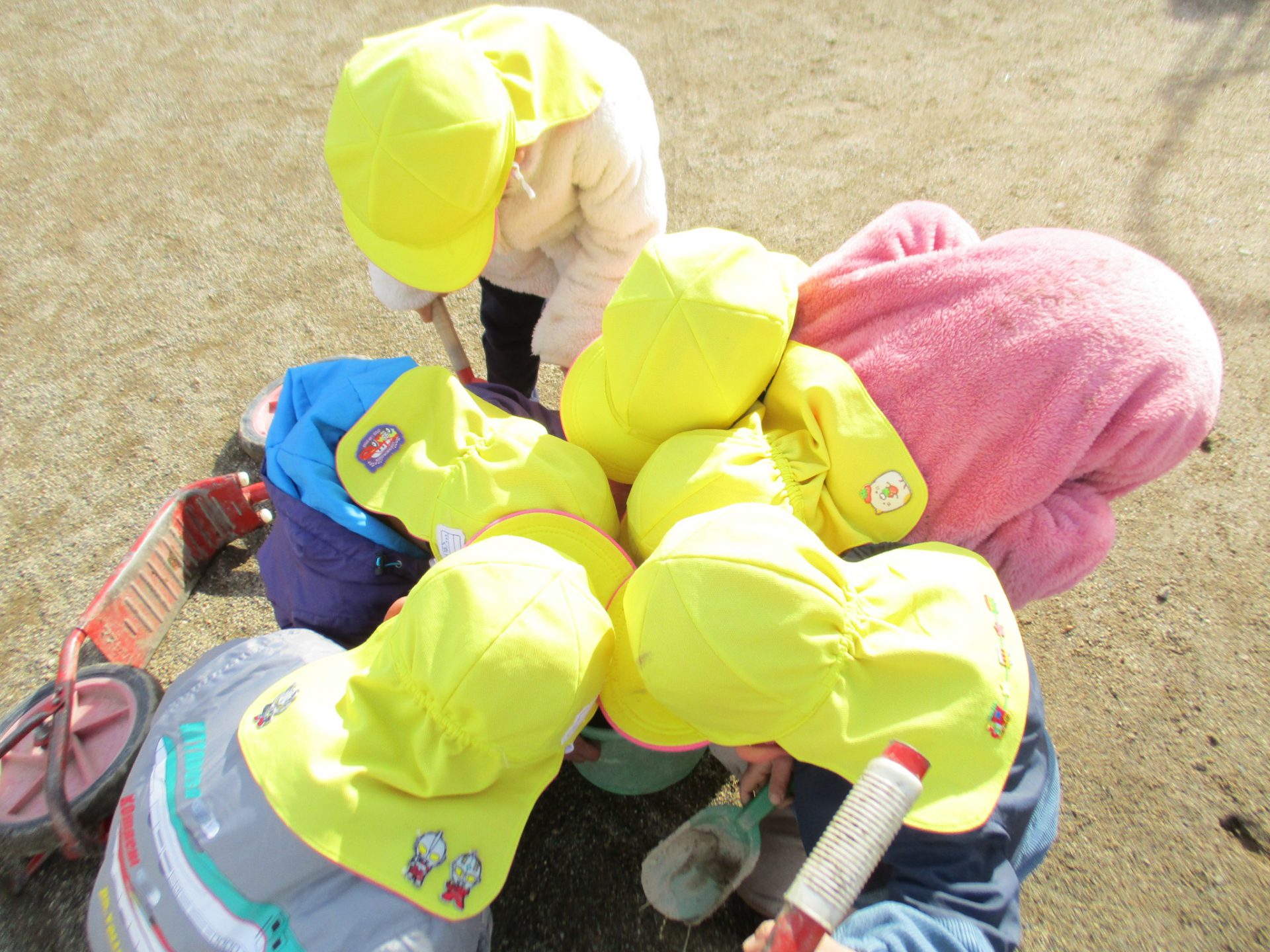 朝、登園してきた子どもたちが園の入り口にあった霜柱を見つけてきました。