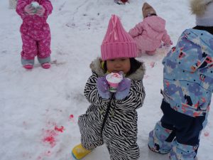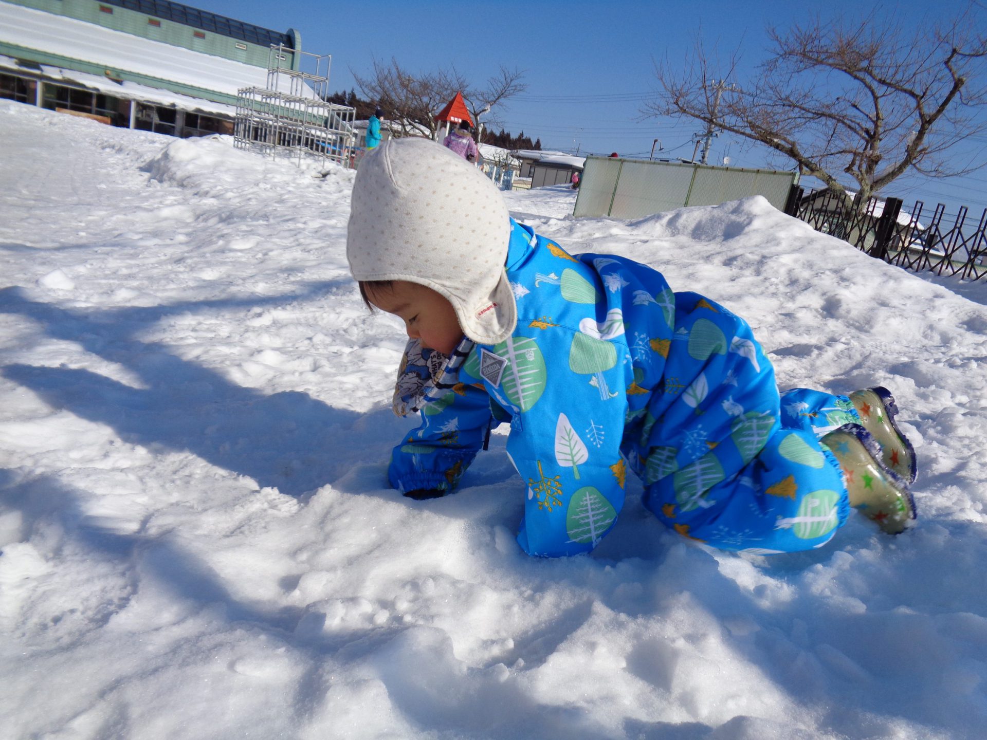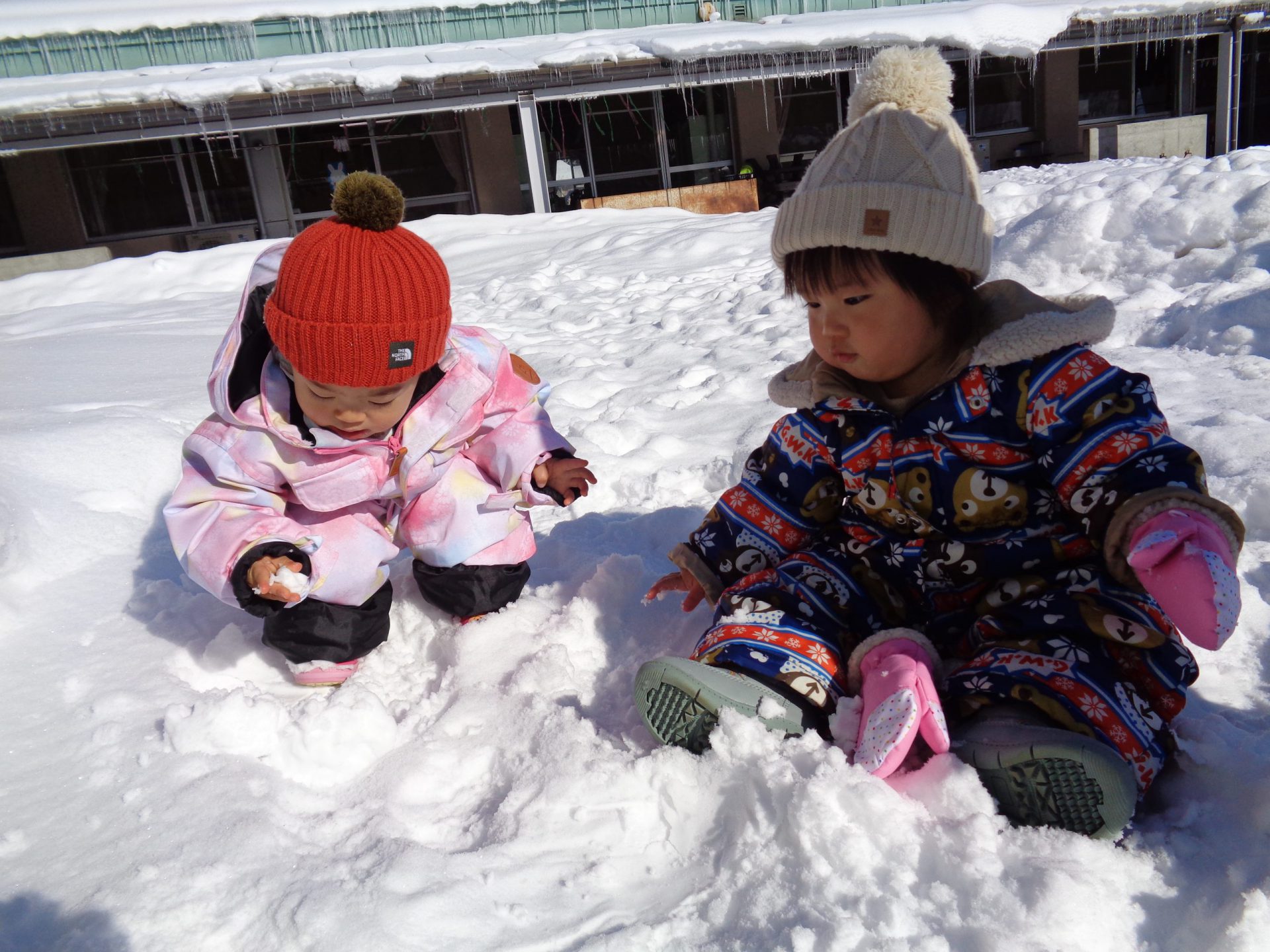 ・0歳児は生まれて初めての雪遊び。触った感触、音、雪の白さなどの体験を通した子どもの驚きや不思議さ、新しい発見を受け止めて楽しく触れ合えるようにしたいと思いました。