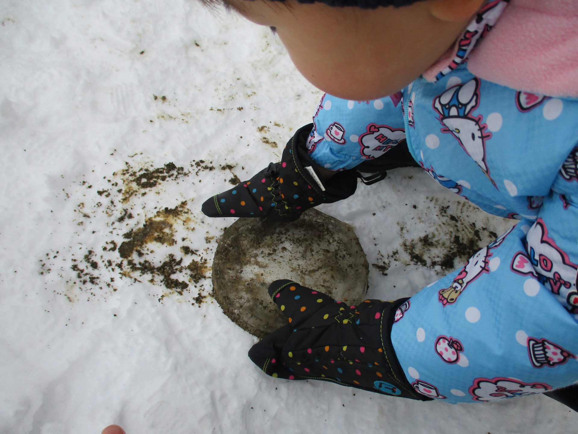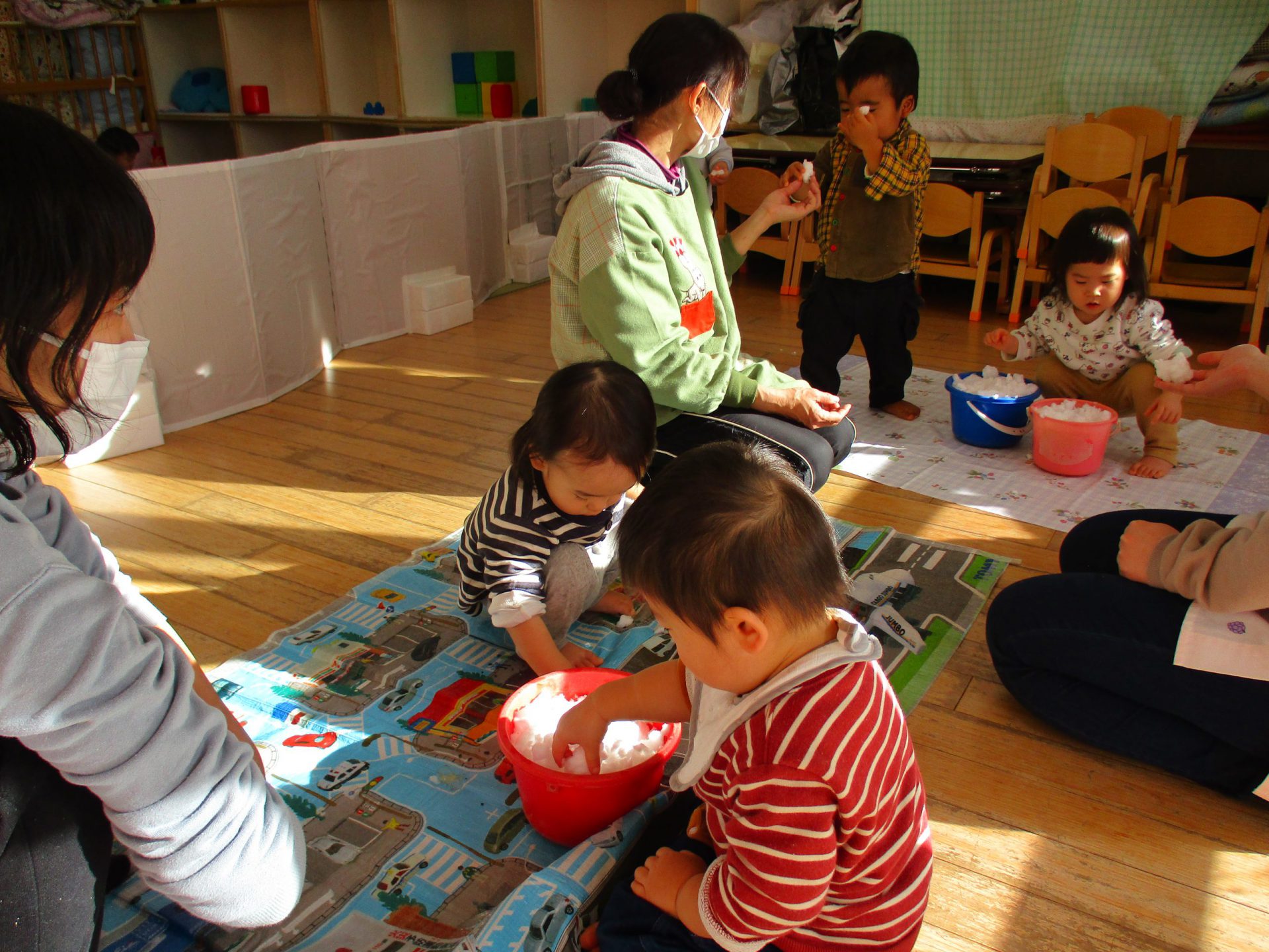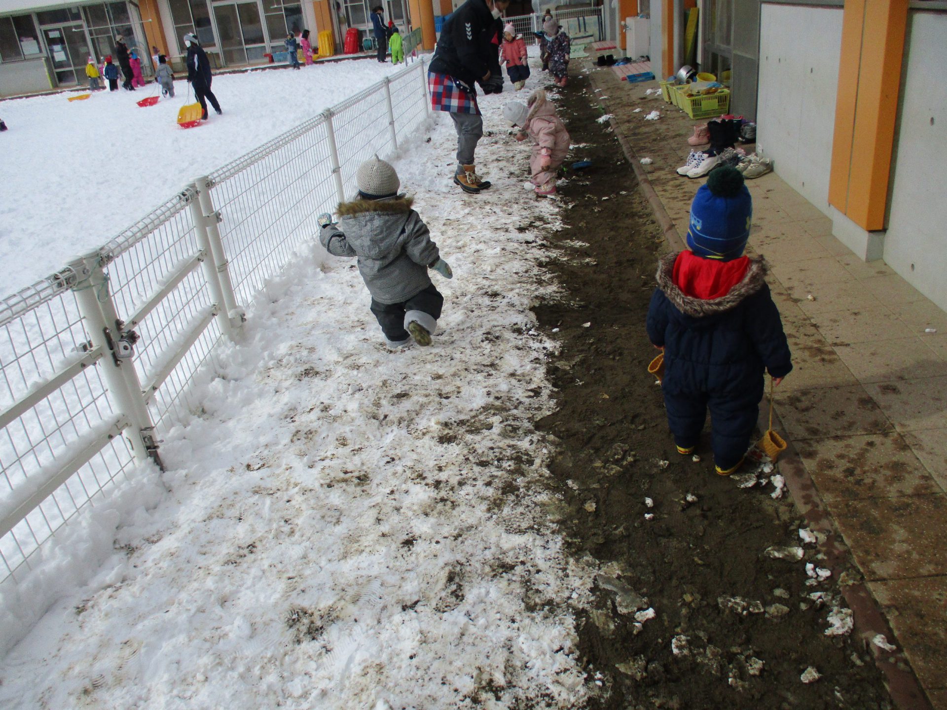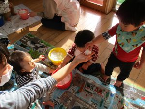最初見ているだけの子も、しばらくするとバケツからバケツへ雪を移し遊び出しました。