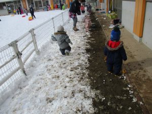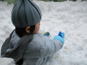中には、両手で雪を触り頬にくっつけてみたり、保育士が丸めた雪を渡すと重ねて楽しむ子ども達もいました。