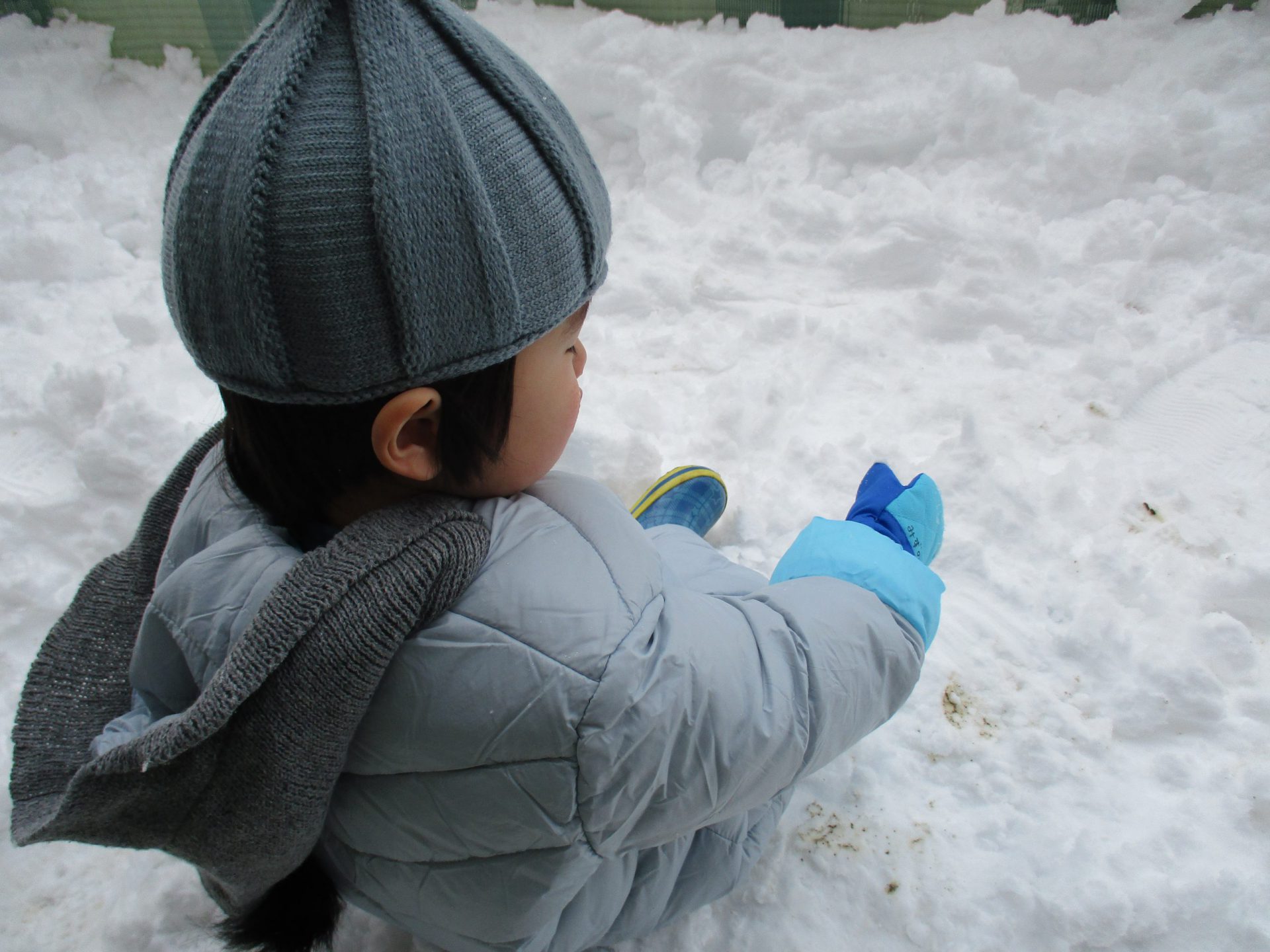 もしかしたら生まれて初めての雪遊び。「これ(雪)って何だろう?触ってみようかな。」から始まって、「雪遊びって楽しいな。」と子ども達が感じてくれたら嬉しいなと思いました。