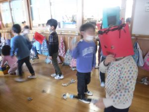 2月3日節分の日。前日まで鬼に変身した年長さんと豆まきごっこを楽しんできた年中さん。