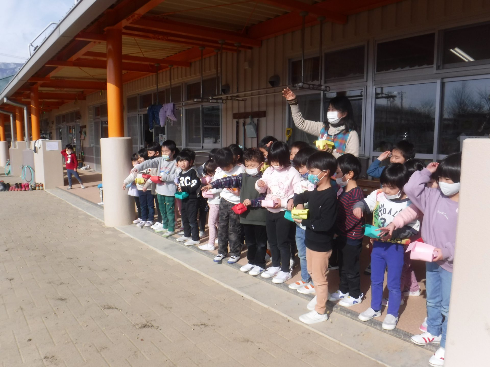テラスへ出てみんなで元気いっぱいお腹の中の鬼をやっつけました!