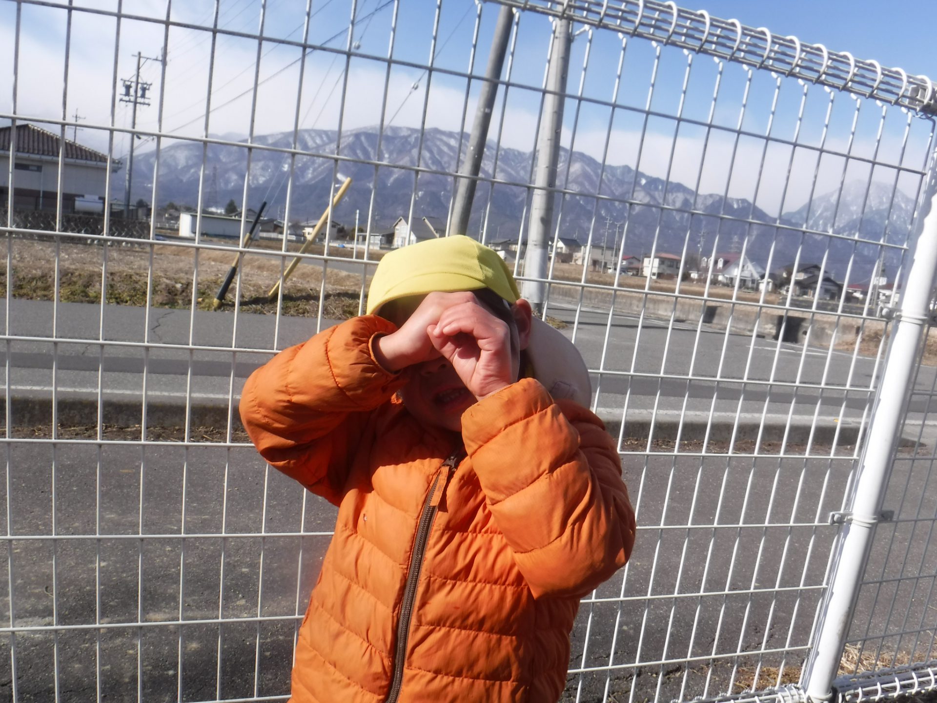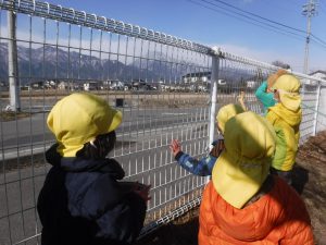 豆まきをした後に戸外へ出ると、築山の方へ向かう子ども達。西の方に見える“有明山”を指して、