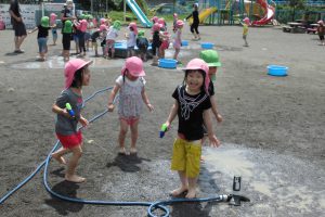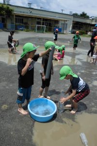 水を入れたたらいや水鉄砲、ホースなどを用意して、子ども達も水遊びの洋服に着替えたら、水遊び開始!!