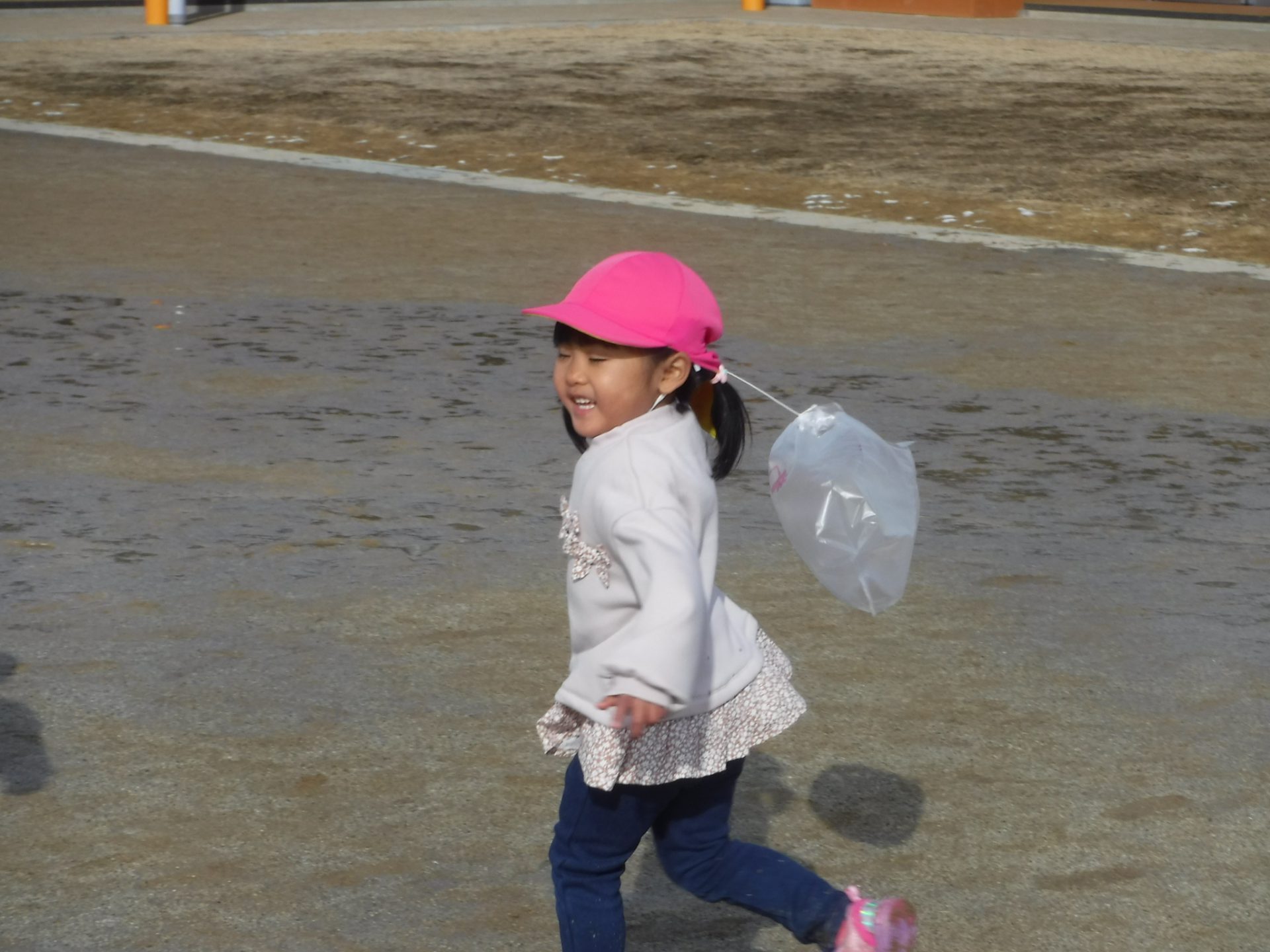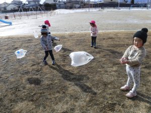 始めは「どうやってやるの?」という子もいましたが、走るとふくらんで浮くことが、わかるとみんな夢中で走り、楽しいあそびになりました。