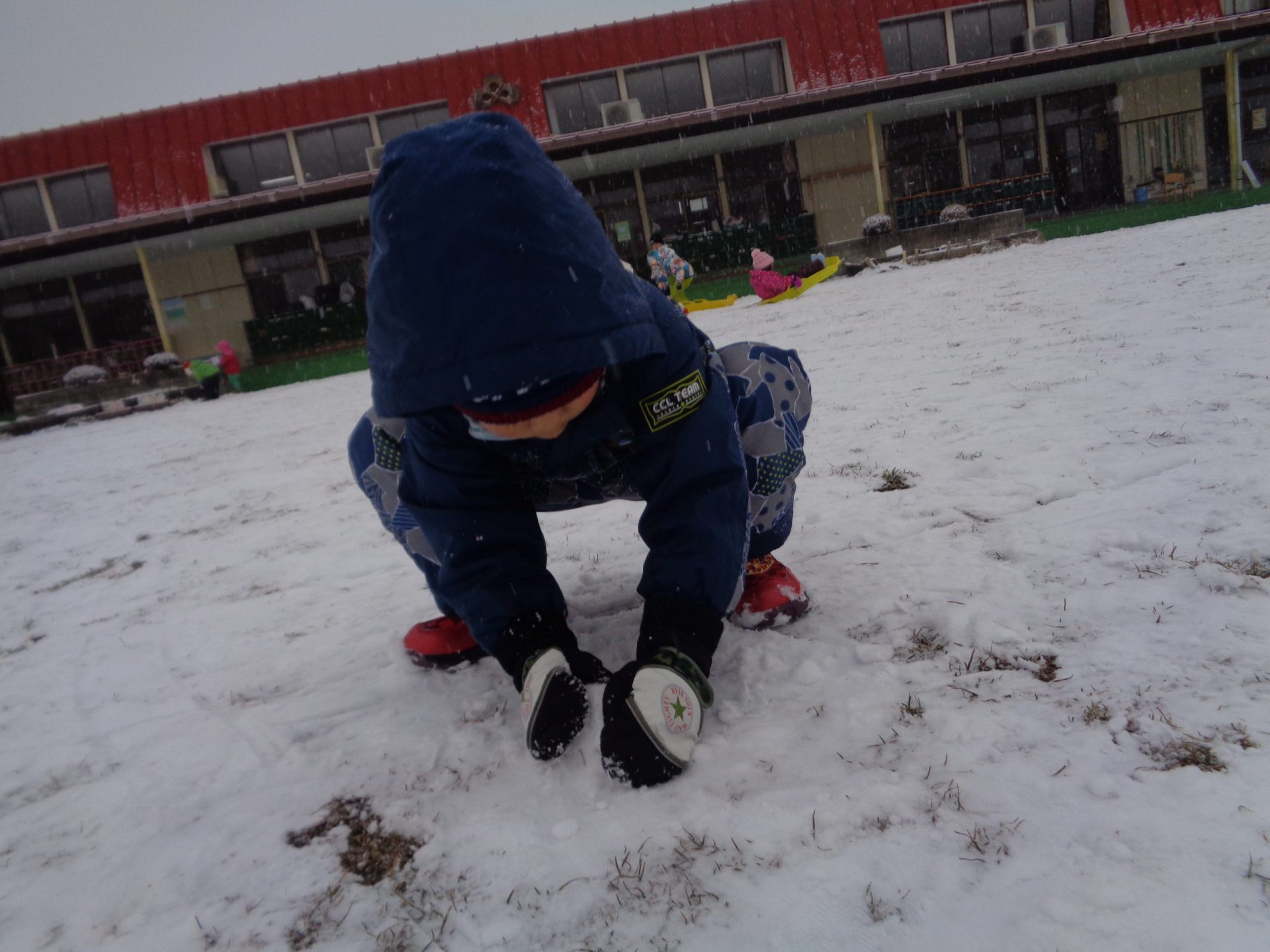薄っすらと積もった雪を目指して、大急ぎで園庭へ出ていきます。