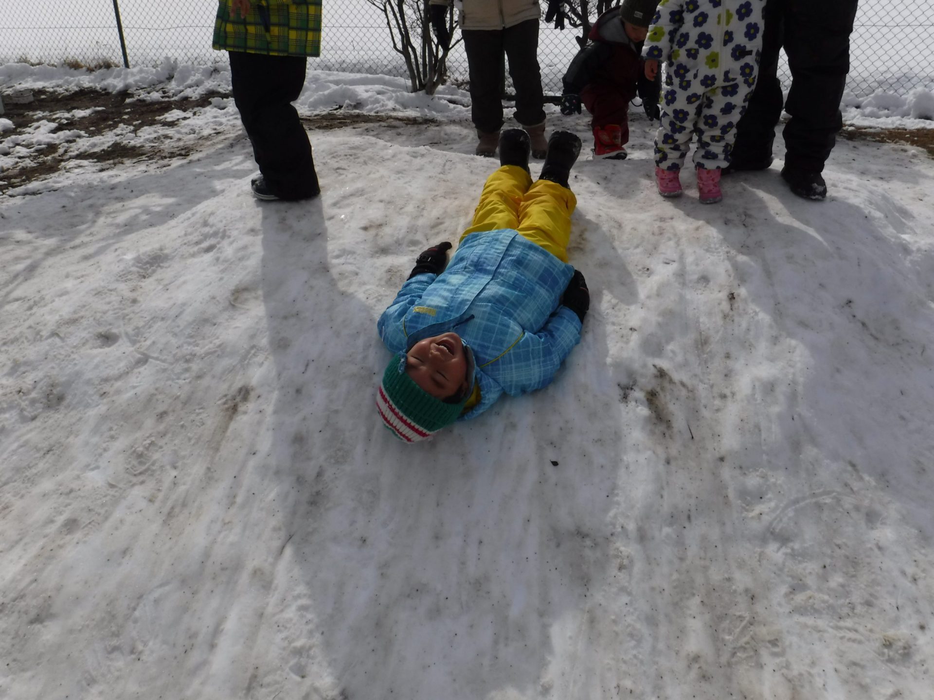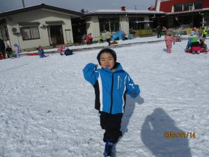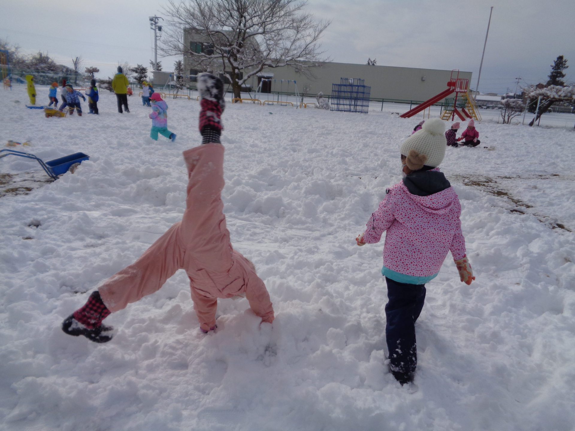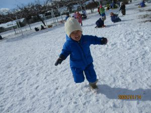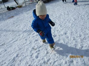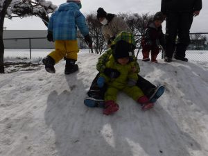 雪がみんなをふんわり包み込んでくれるので、転んでも大丈夫。勇気を出してちょっと怖いけどやってみようというチャレンジする姿が沢山見られた雪遊び。先生はそっと見守ります。