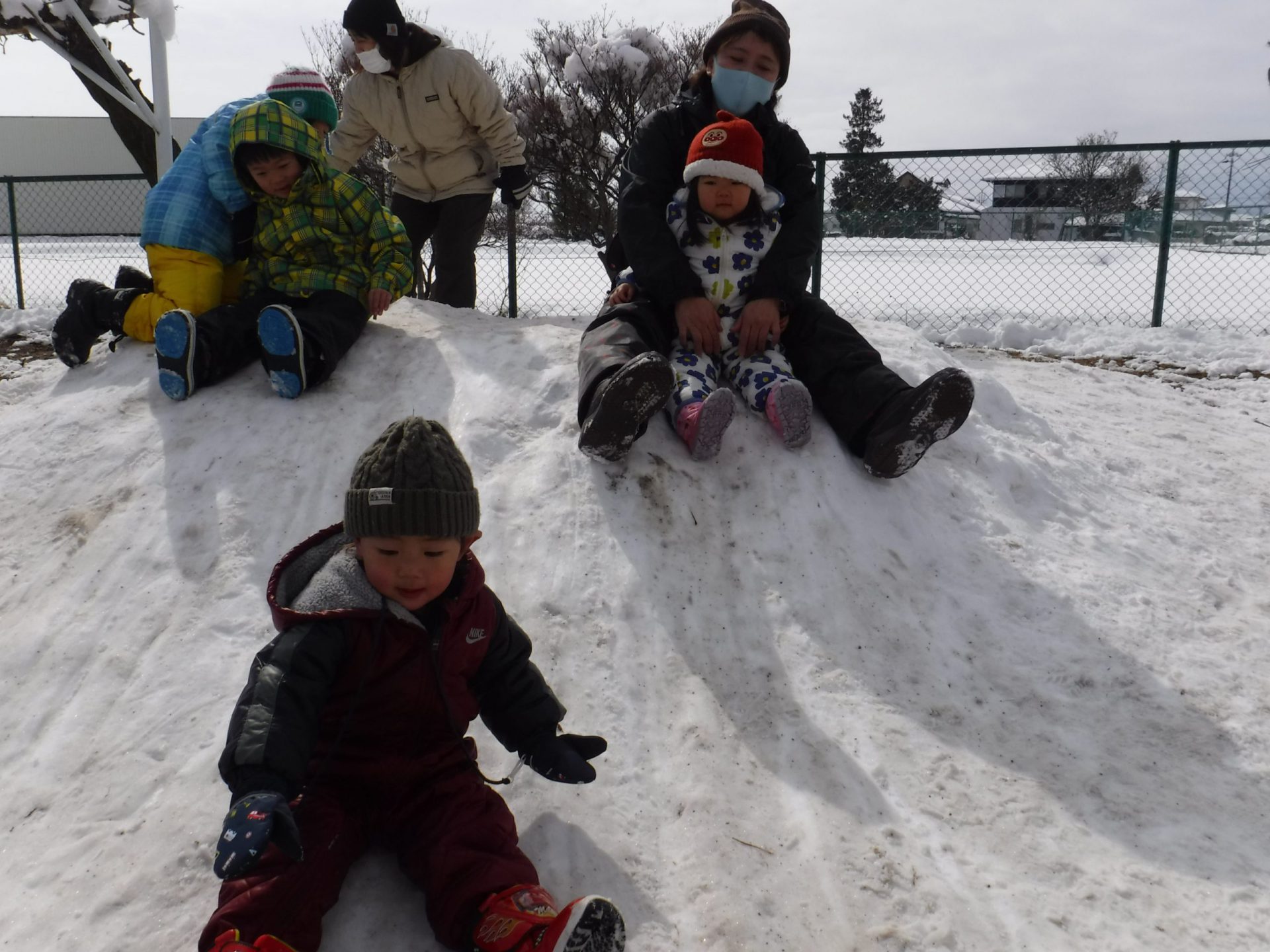 0歳・1歳児の小さなお友だちも恐る恐る先生と一緒に滑ります。慣れてきたら一人でチャレンジしてみます。