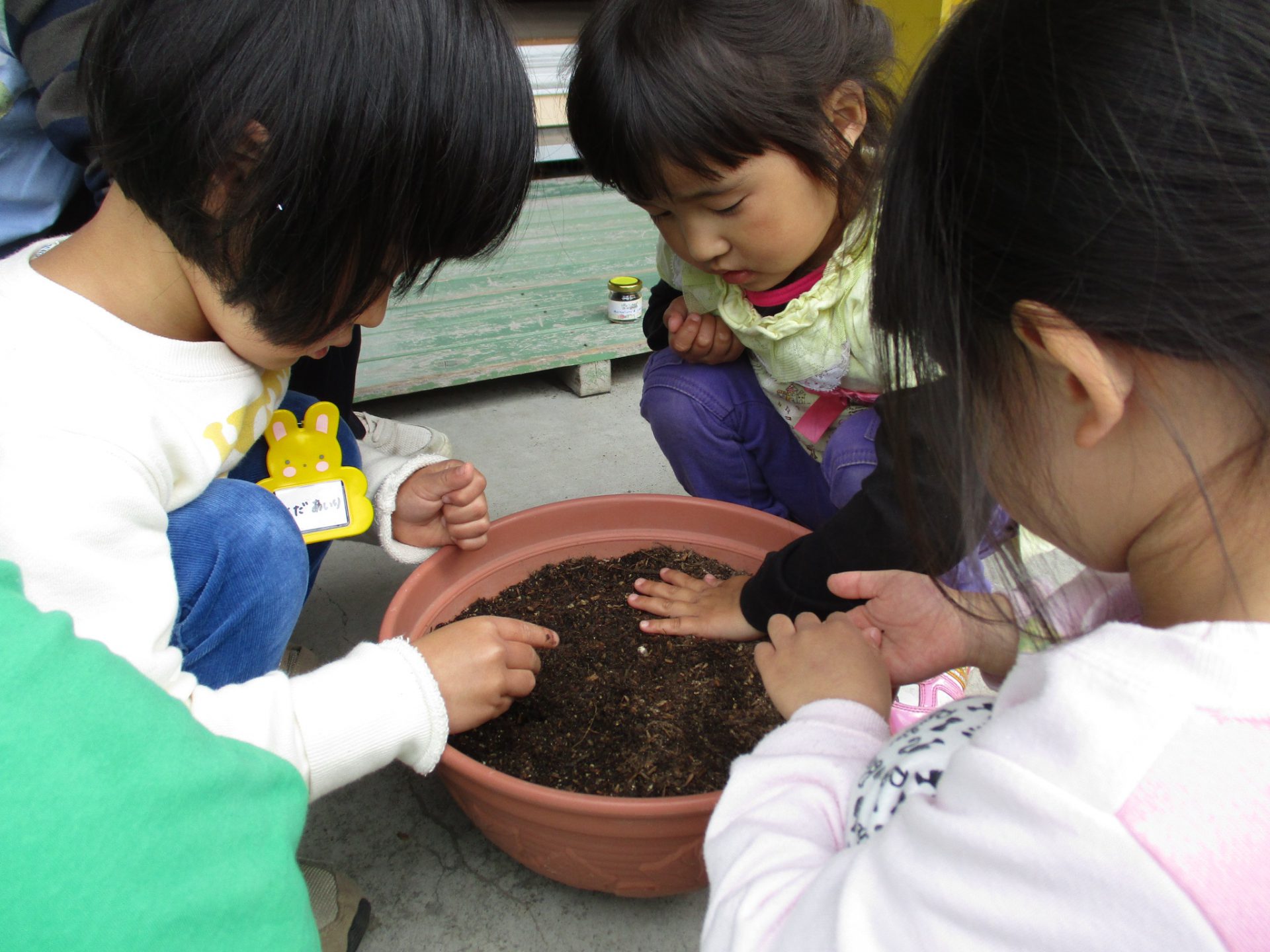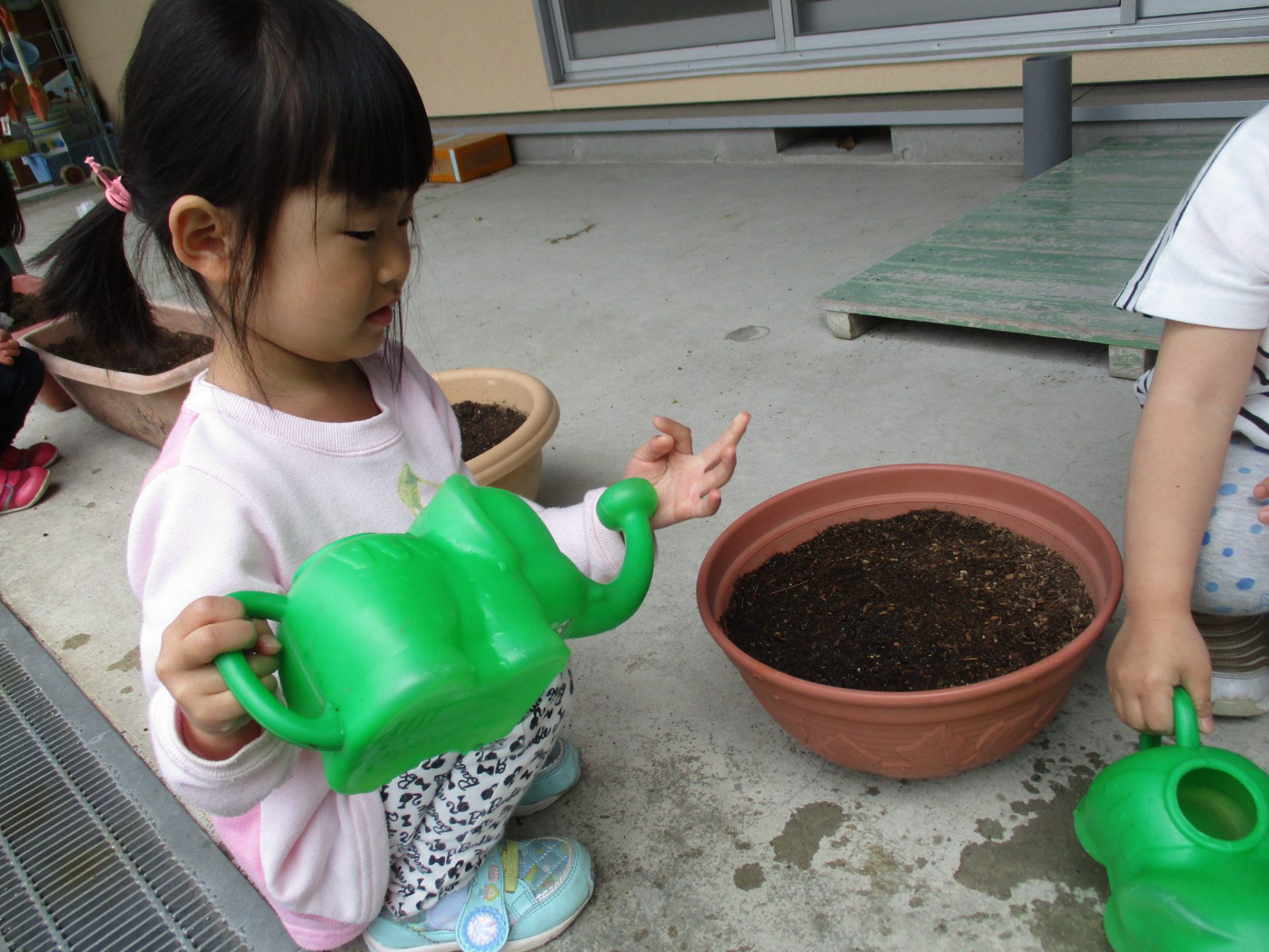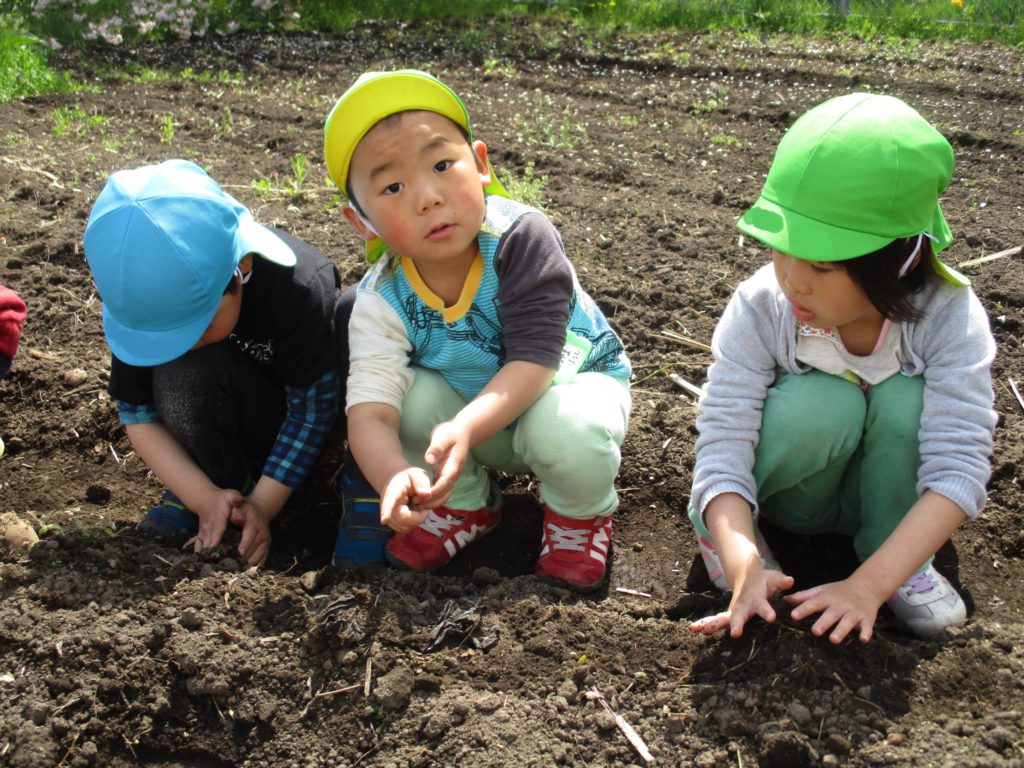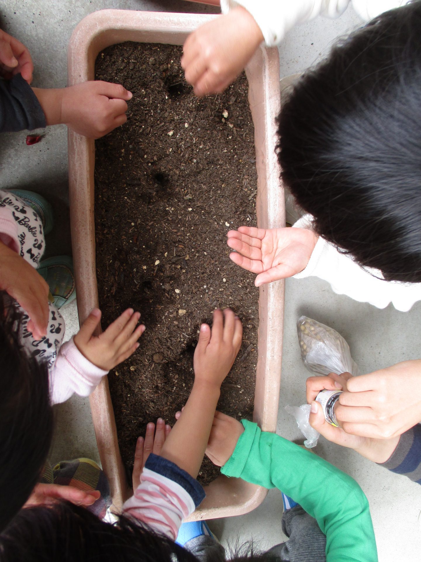 「これが大豆だよ。」「おいしい枝豆できるかな。」先生の手元をジッと見つめ土をかけるときも真剣です。しっかりかけようとして土をぎゅーっとしすぎてしまう場面も!「やさしくかけてあげようね。」と伝えると「うん!」とかけ直してあげていました。