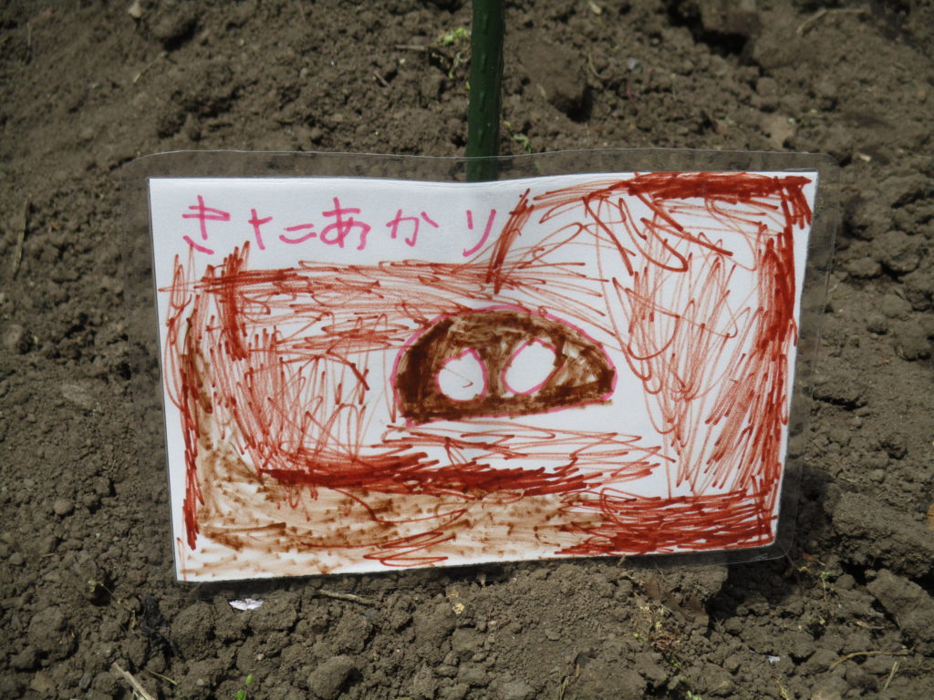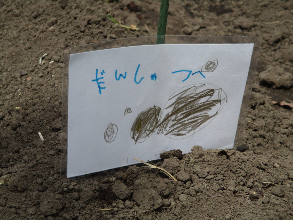 「植えたところは踏まないようにしようね。」と保育士が言うと「どこに植えたかわかんなくなっちゃいそう。」とぽつり。「看板立てとこう!」と案が出てきたあかりとだんしゃくの看板ができました。大きくなりますように。