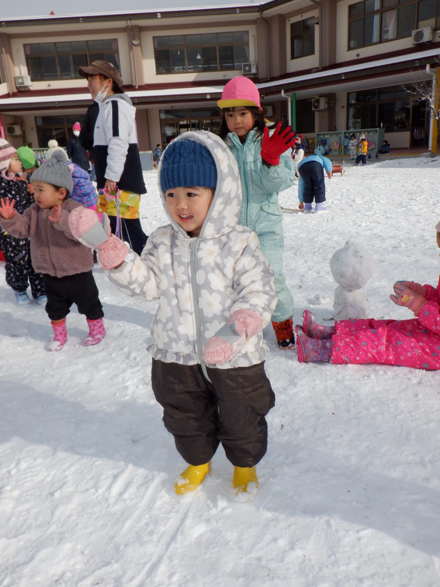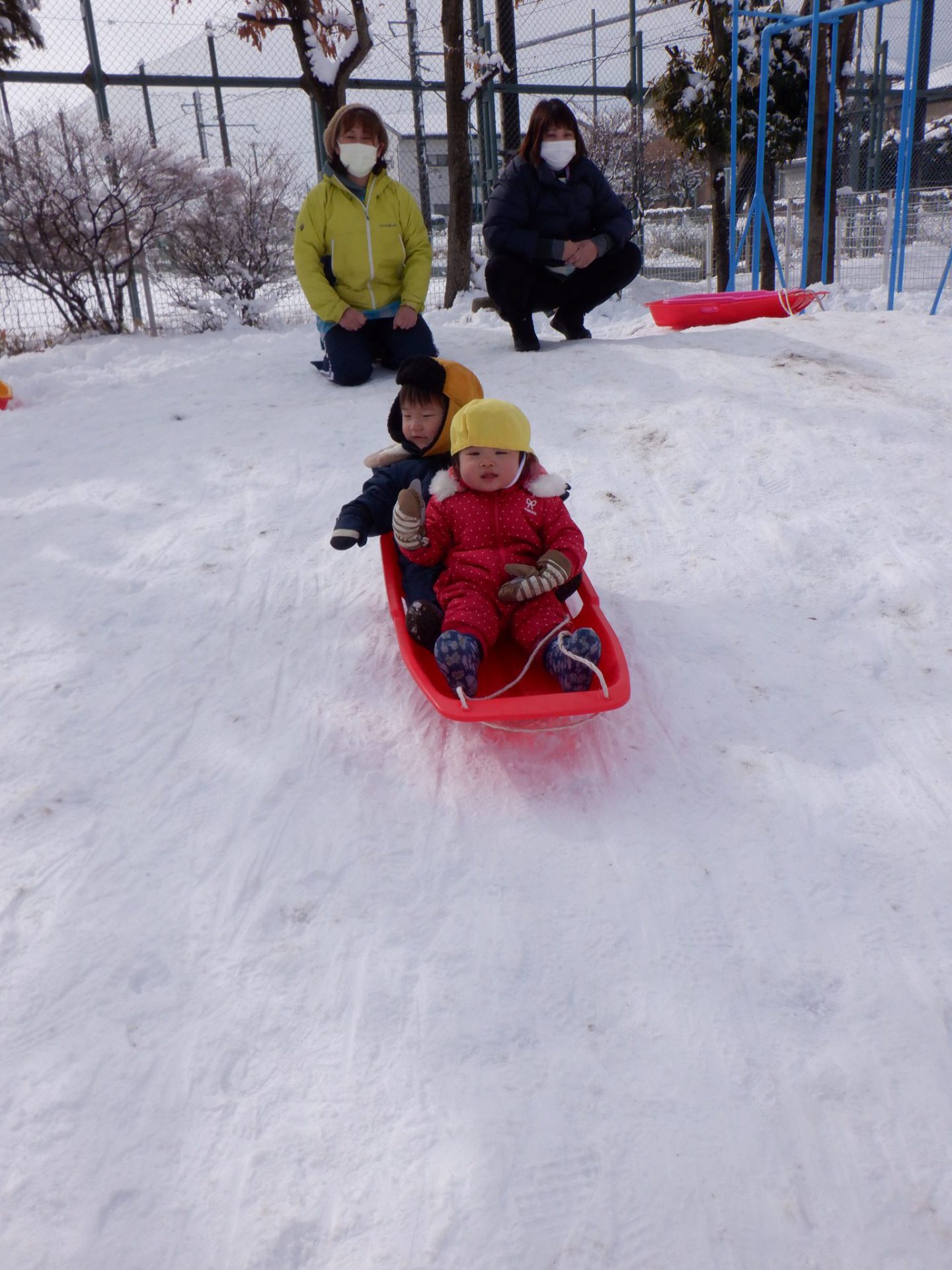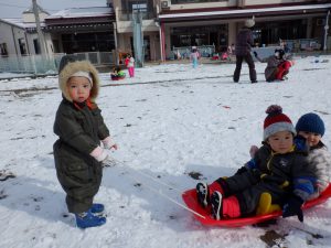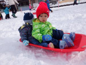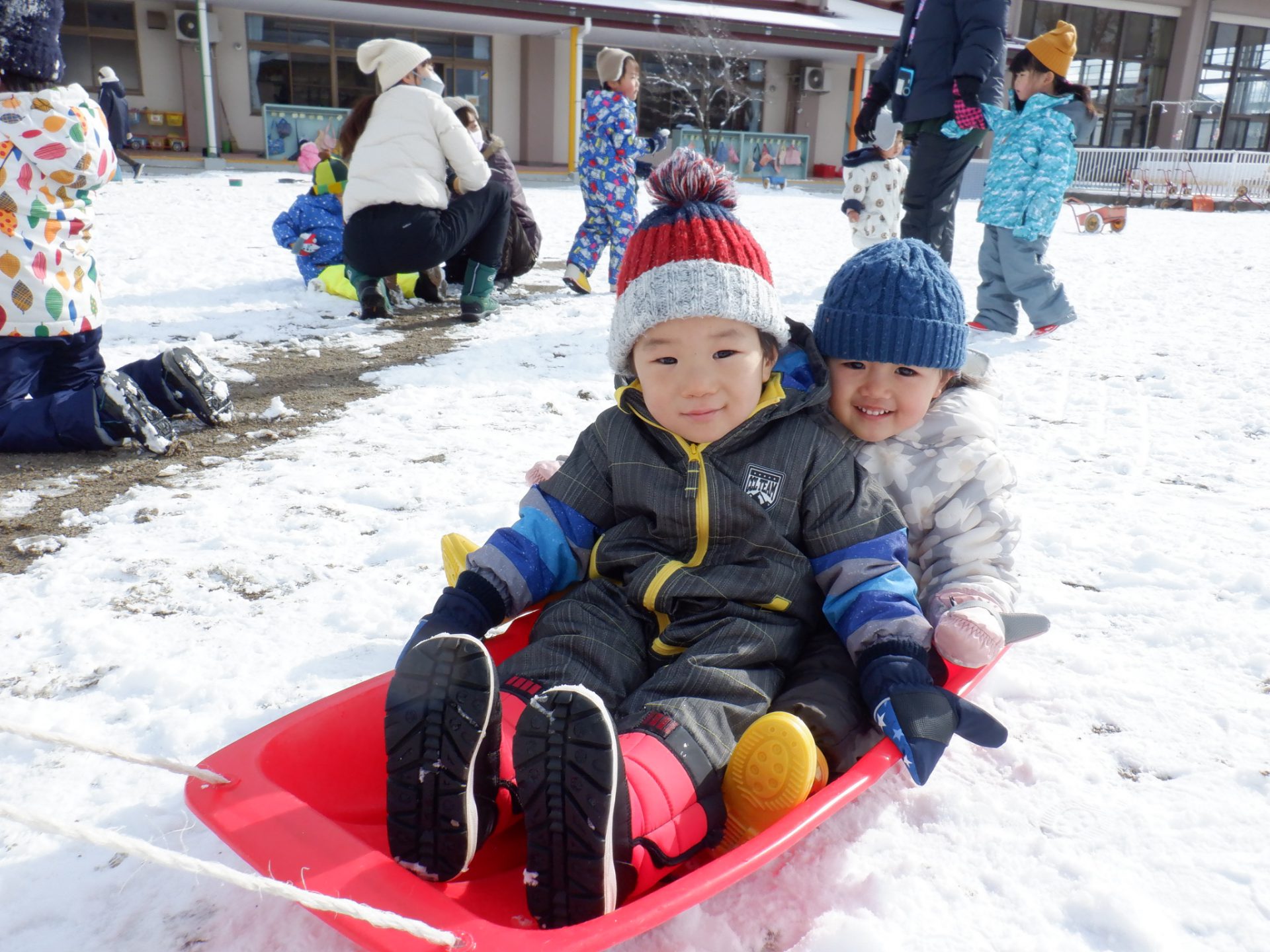 雪に触れてみたり、ソリに乗ったり引っ張ったり、好きな遊びを楽しむ子どもたちでした。